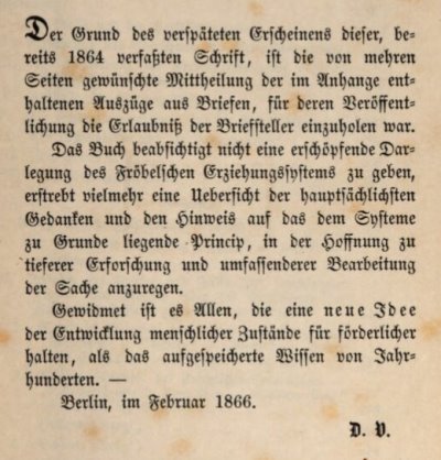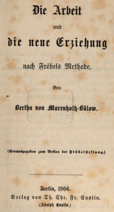 'Die Arbeit und die neue Erziehung nach Froebel's Methode' (Work and the new education according to Froebel's method) by Bertha von Marenholz-Bulow was published by Adolph Enslin in Berlin in 1866. The Foreword states that the work was complete in 1864 but publication had to be postponed pending the obtaining of permission to publish some of the correspondence. The work contains a section about Froebel's Intermediate Class (a transition between kindergarten and trade school),