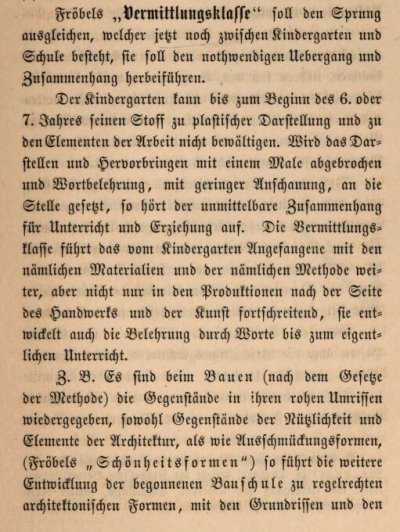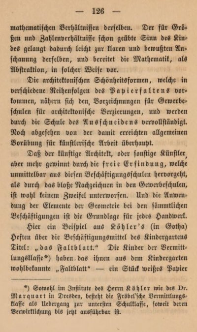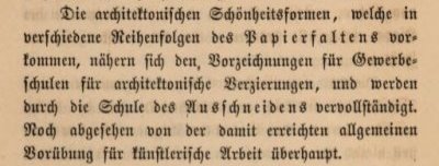 Explains the relevance of paperfolding as a bridge between the two educational stages: Roughly translated: 'The architectural Schonheitsforman, which appear in various sequences of paperfolding, approach the preliminary drawings for trade schools for architectural decorations and are completed by the school of Ausschhneiden.'