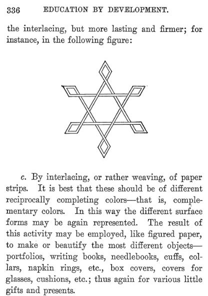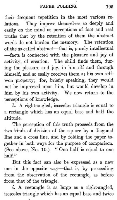 'Friedrich Froebel's Education by Development: The Second Part of the Pedagogics of the Kindergarten' translated by Josephine Jarvis was published by D Appleton and Company in New York in 1899. It is a translation of part of Volume 2 of 'Gesammelte pädagogische Schriften' (Collected Educational Writings), an anthology of Froebel's writings edited by Wichard Lange and published in Berlin in 1862. A full copy of the work can be accessed online here. ********** ********** Analysis This work contains a translation into English of Froebel's fragment 'Anleitung zum papierfalten' (Instructions for Paperfolding) - see Selected Pages below - in which Froebel: Describes how to create a square from an irregular sheet of paper: ********** Describes how to cut four squares from a rectangular sheet of paper: ********** Describes a number of simple folds that can be made in the square and the mathematical properties that they demonstrate. Froebel's descriptions of the folds are often difficult to follow but I believe they culminate in the construction of The Double Blintz Basic Form, which he describes as: And of which he says: ********** The work also contains a translation of Chapter XXX of Lange which contains mention of: Interlacing (Verschnuren) ********** and what appears to be Cardboard Modelling ********** Selected Pages