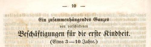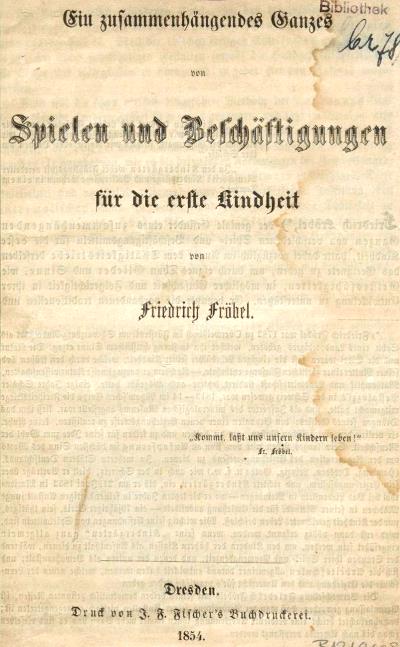 'Ein zusammenhängendes Ganzes von Spielen und Beschäftigungen für die erste Kindheit' (A coherent whole of games and activities for early childhood) was published by J B Fischer in Dresden in 1854. The work is anonymous but according to a list of her writings in 'The Life of the Baroness Marenholz-Bulow' (available online here) it was written by Baroness von Marenhoz-Bulow.