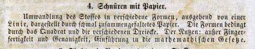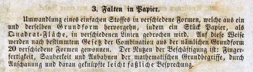 ********** Falten in Papier - Falten Roughly translated this section reads: 'Transformation of a simple material into various forms, which arise from one and the same basic form, by folding a square sheet of paper along different lines. In this way, according to a specific law of combinations, 20 different forms are obtained from the same basic form. The aims of the activity are dexterity, neatness, and the development of basic mathematical concepts through visualisation and associated, easily understandable, discussion.' Reference to the 'law of combinations' tells us that the 20 forms are Schönheitsformen, almost certainly designs developed from the Double Blintz Basic Form.