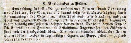********** Ausschneiden in Papier - Ausschneiden und Aufkleben Inter alia this section says, roughly translated: 'The small pieces of paper that fall off during cutting are glued onto cardboard in regular shapes to practice economy.'