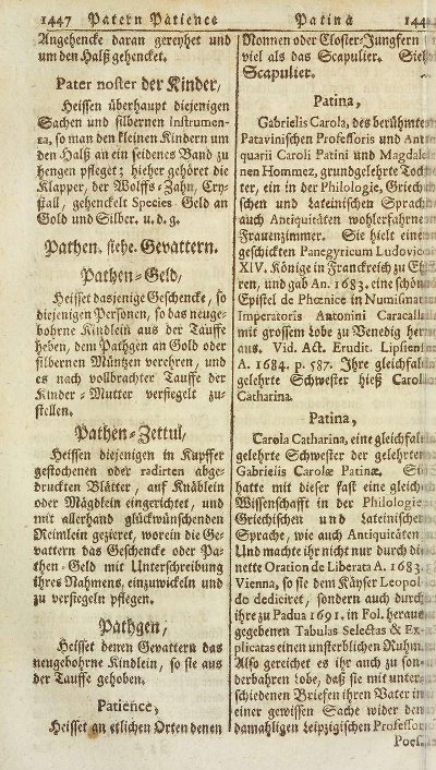 in Leipzig in 1715. It contains an early definition of Taufbriefs / Patenbriefs, which is useful in understanding their physical form and purpose. Information from Pennsylvania German Blog May 2016. ********** The entry for 'Patten-Zettul' (Godparent Letter) reads: In the original German: 'Pathen-Zettul. Heissen diejenigen in Kupffer gestochenen oder radirten abge druckten Blätter, auf Knäblein oder Mägdlein eingerichtet, und mit allerhand glückwünschenden Reimlein gezieret, worein die Gevattern das Geschenke oder Pathe Geld mit Unterschreibung ihres Nahmens, einzuwickeln und zu versiegeln pflegen.' In English: 'Patten-Zettul are those printed papers with copper etchings or engravings intended for a baby boy or girl, and are decorated with all kinds of rhyming congratulatory verses. The godparents sign their names on the sheets; tuck their gifts or sponsor money into them; and usually wind something around to make them secure.' **********
