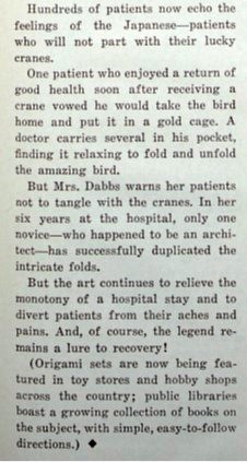 magazine Vol 165, Issue 6 of December 1967. The article focuses on Mrs Rose Dabbs and her work with patients in hospital making 'a crane whose wings flap and whose beak moves', probably a version of the Flapping Bird. **********