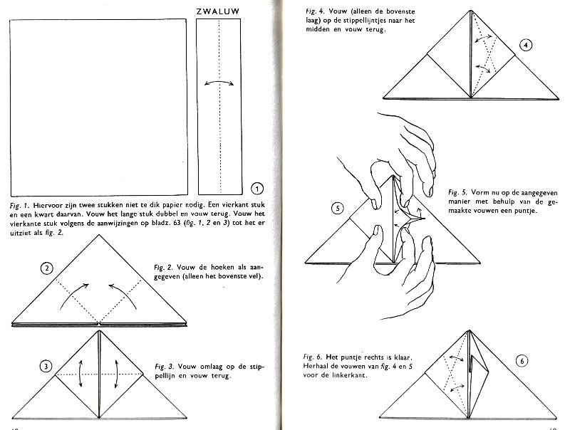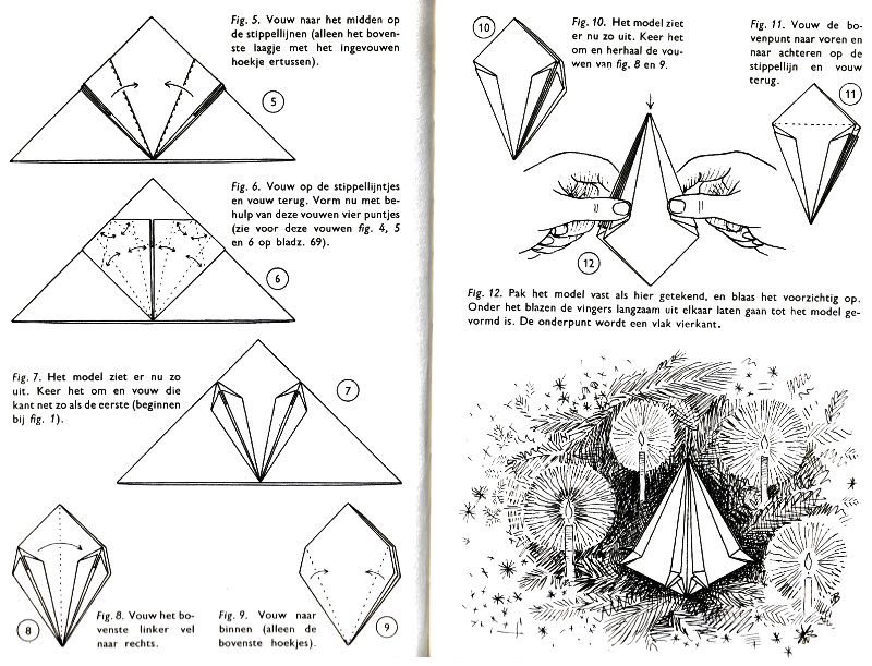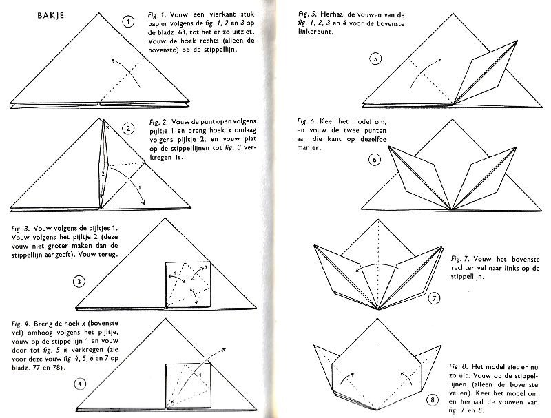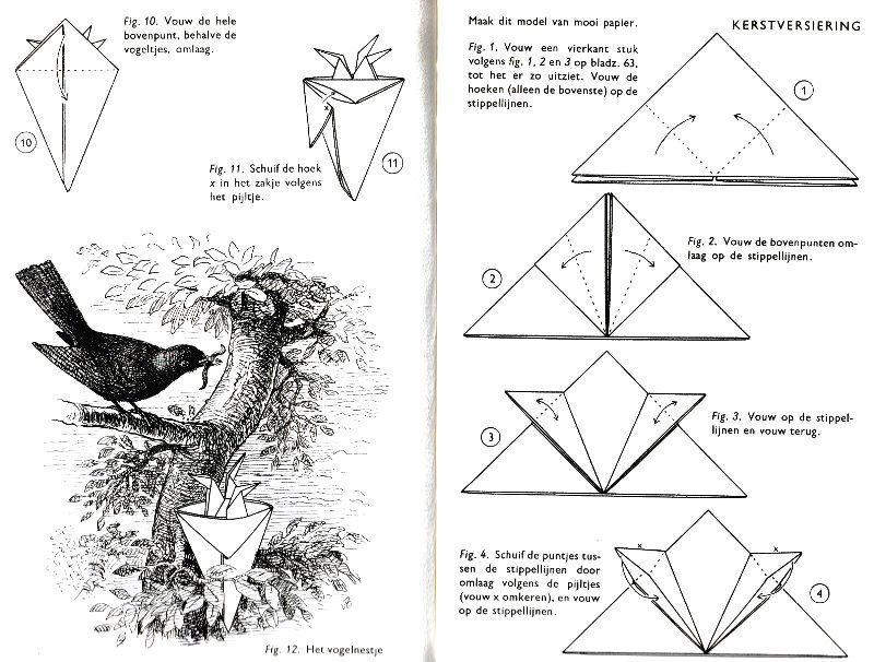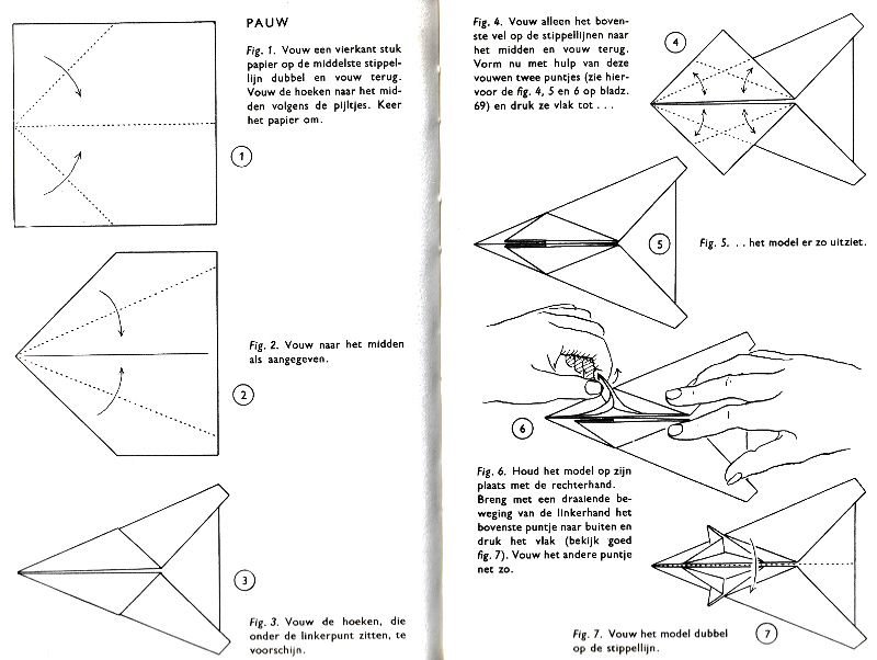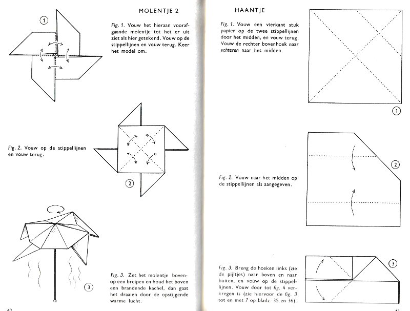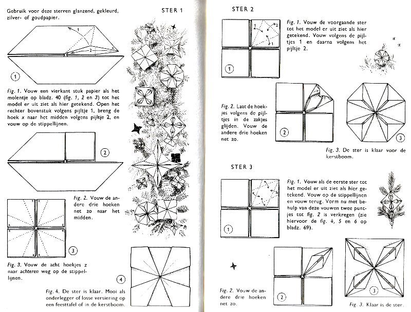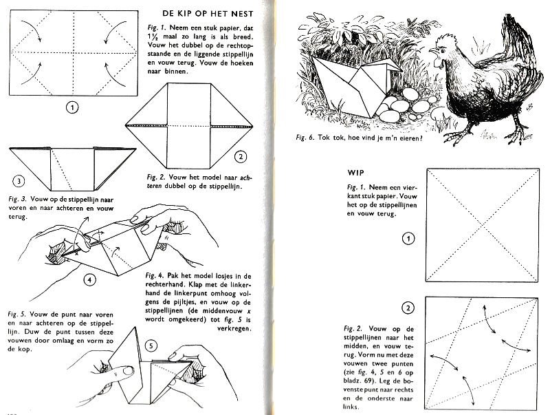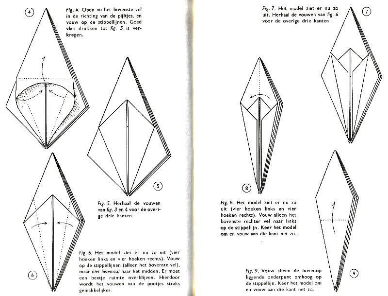 ********** Roughly translated this Foreword reads: 'As a child I tore the pages from notebooks and folded them into swallows (ie the swallow paper plane). I'd pin little paper propellors to them, which would whistle in the wind. Sometimes a gust would catch one of them, and once my swallow flew so high it disappeared over the school roof. My mother taught me how to fold a boat. I'd fold whole rafts out of newspaper. Paperfolding has intrigued me for years. Where does it come from? Froebel explored it, and he probably wasn't the first. Froebel folding has produced some beautiful things (the best models, in my opinion, are included in this book) but it more or less fizzled out, perhaps because it was too much of a teaching tool and wasn't practised fopr its own sake, for the fun of playing with a piece of paper? For the vibrant art of paperfolding (origami as the Japanese call it) we must travel to the Far East. The flying bird, perhaps the most beautiful folding pattern ever discovered, originated there. The way this ingenious pattern is folded has liberated the art of paperfolding from its seemingly limited possibilities and opened up new horizons, the end of which we will hopefully never see. (I have omitted two paragraphs here.) About half of the book contains very old models, and the other half, as far as I know, are my own discoveries. These include tables, chairs, animals, boats , stars, and some decorations. I particularly liked the latter because I found them beautiful in their own right, lacking any resemblance to anything. Their abstract nature, in my opinion, opens up a new field of possibilities. (The last two paragraphs are not translated here.)