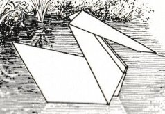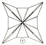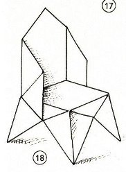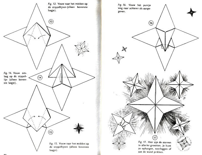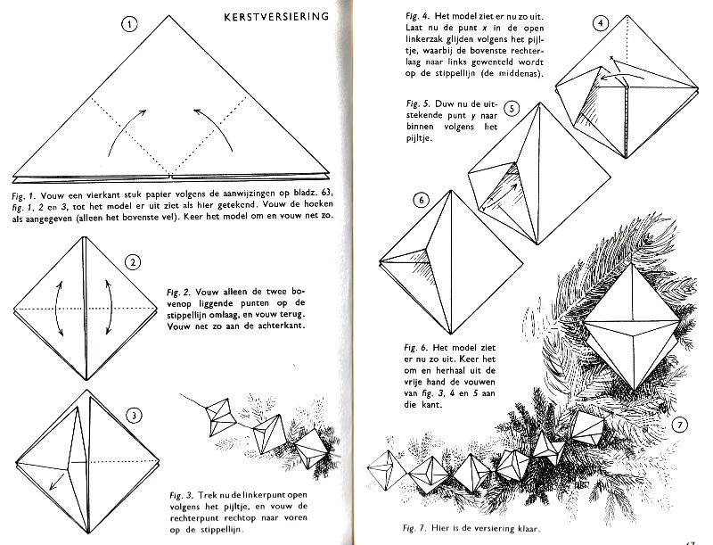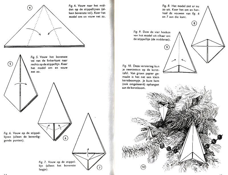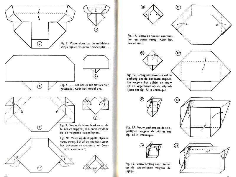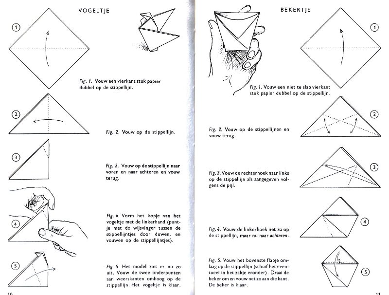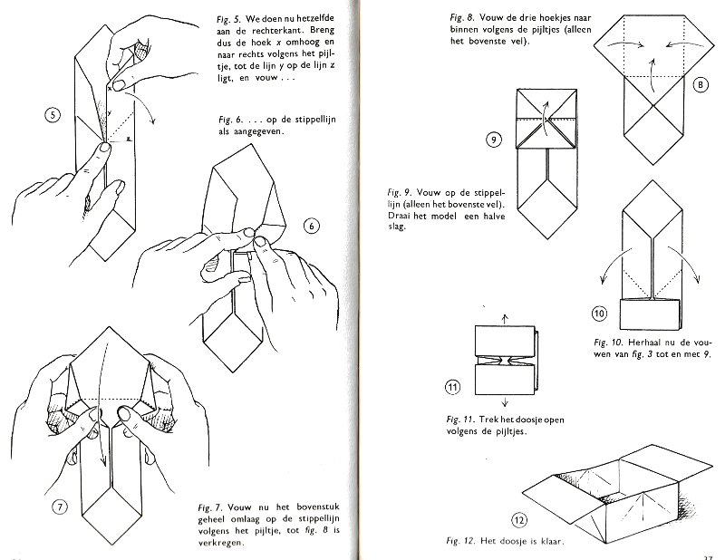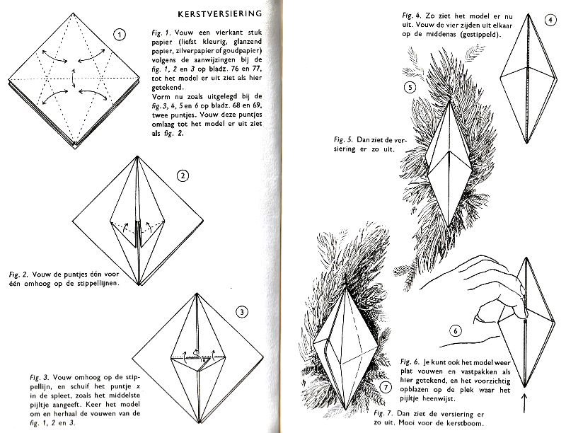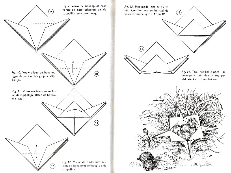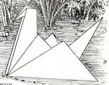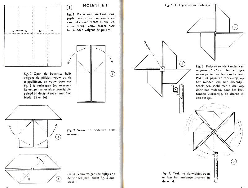 ********** Roughly translated this Foreword reads: 'As a child I tore the pages from notebooks and folded them into swallows (ie the swallow paper plane). I'd pin little paper propellors to them, which would whistle in the wind. Sometimes a gust would catch one of them, and once my swallow flew so high it disappeared over the school roof. My mother taught me how to fold a boat. I'd fold whole rafts out of newspaper. Paperfolding has intrigued me for years. Where does it come from? Froebel explored it, and he probably wasn't the first. Froebel folding has produced some beautiful things (the best models, in my opinion, are included in this book) but it more or less fizzled out, perhaps because it was too much of a teaching tool and wasn't practised fopr its own sake, for the fun of playing with a piece of paper? For the vibrant art of paperfolding (origami as the Japanese call it) we must travel to the Far East. The flying bird, perhaps the most beautiful folding pattern ever discovered, originated there. The way this ingenious pattern is folded has liberated the art of paperfolding from its seemingly limited possibilities and opened up new horizons, the end of which we will hopefully never see. (I have omitted two paragraphs here.) About half of the book contains very old models, and the other half, as far as I know, are my own discoveries. These include tables, chairs, animals, boats , stars, and some decorations. I particularly liked the latter because I found them beautiful in their own right, lacking any resemblance to anything. Their abstract nature, in my opinion, opens up a new field of possibilities. (The last two paragraphs are not translated here.)