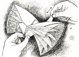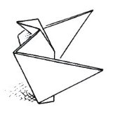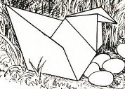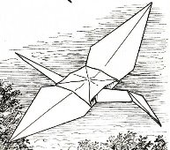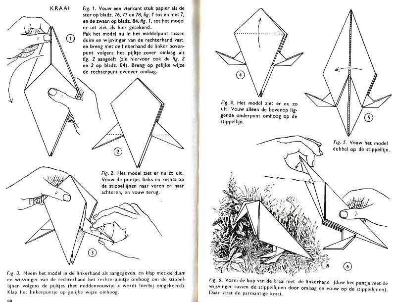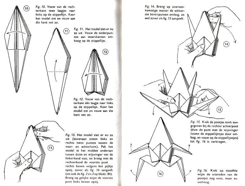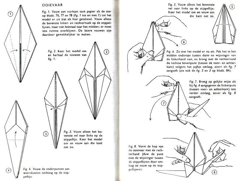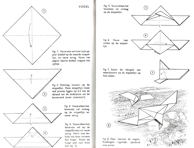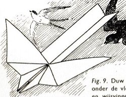 ********** Vliegend Volgeltje - The Flapping Bird In his Foreword the author says of this design: 'For the vibrant art of paperfolding (origami as the Japanese call it) we must travel to the Far East. The flying bird, perhaps the most beautiful folding pattern ever discovered, originated there. The way this ingenious pattern is folded has liberated the art of paperfolding from its seemingly limited possibilities and opened up new horizons, the end of which we will hopefully never see.