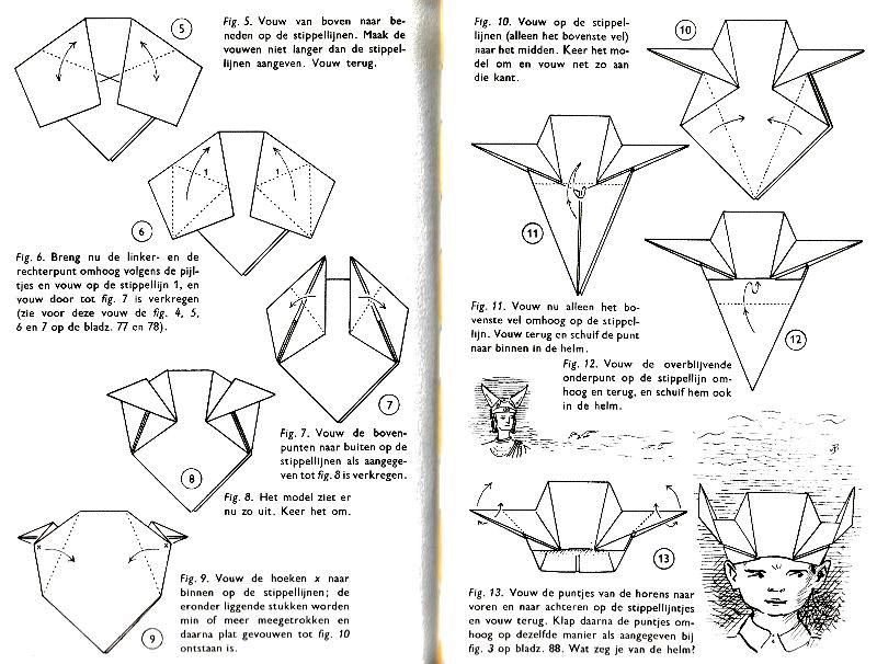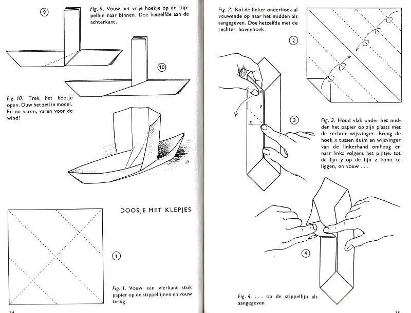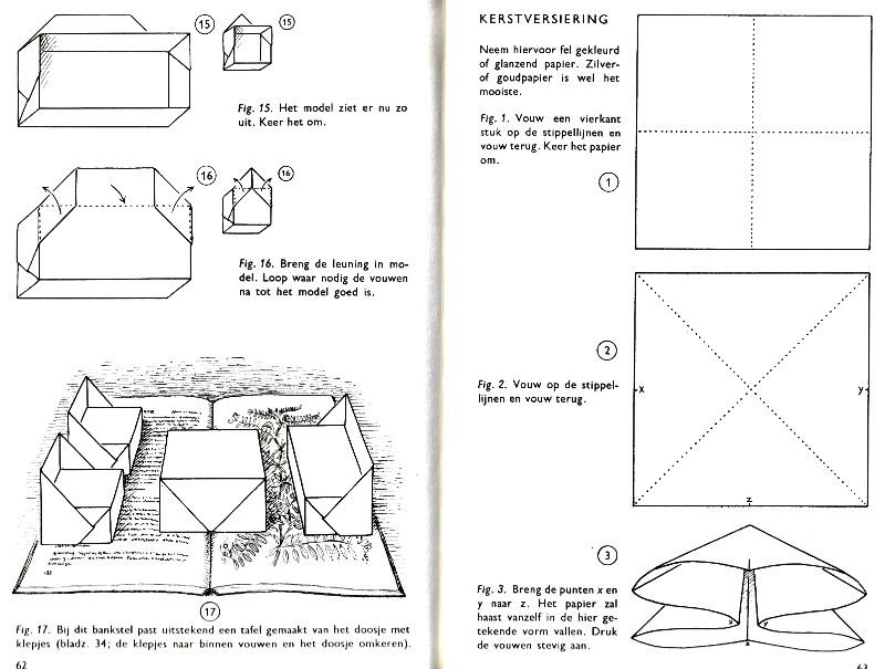 effectively a different work. In his Foreword the author says: 'About half of the book contains very old models, and the other half, as far as I know, are my own discoveries. These include tables, chairs, animals, boats, stars, and some decorations.' The author does not specifically label those designs which are his own invention, but since many of the designs are not previously known it seems logical to infer that these are the designs he is referring to. An English translation titled 'Paper Folding and Modelling' was published in 1965. A German translation titled 'Kempers Grosses Papierfaltbuch: Falten und gestalten' was published in 1965. A Spanish translation 'Origami: el arte del papel plegado' was published in 1972. **********