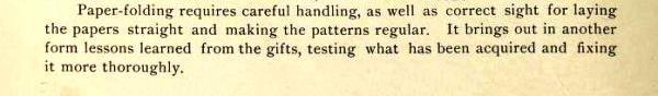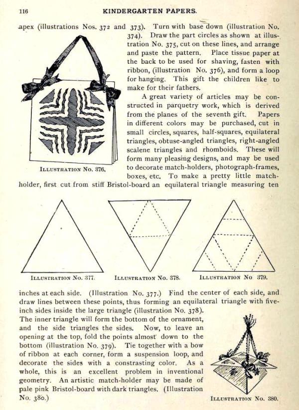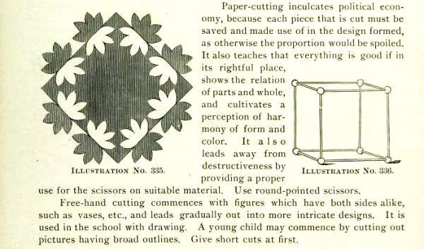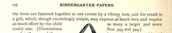 'Kindergarten Papers' by Sara Miller Kirby was published by The Butterick Publishing Company Ltd in New York in 1896. It contains information about Paperfolding, Free Weaving and Auschneiden und Aufklaben. The Introduction states that the articles it contains had previously been published in 'The Delineator'. I have not however been able to find the information about paperfolding which appears in the book in the issues of 'The Delineator' available to me. A full copy of the work can be accessed online here. **********