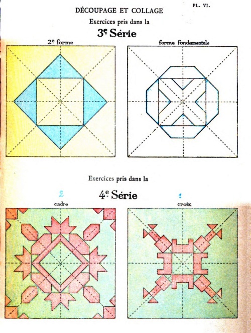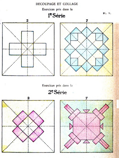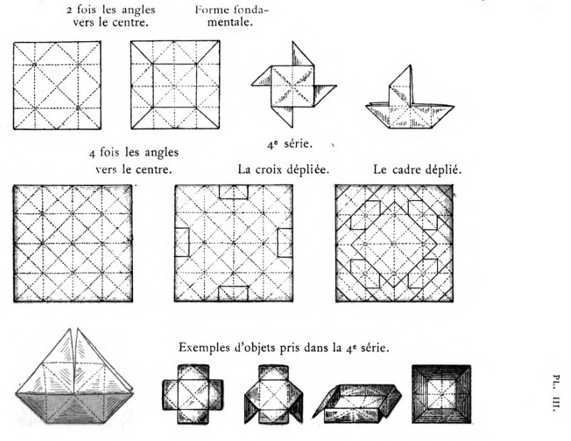 ********** Plate IV shows two examples of designs that can be cut from a square folded diagonally in half twice using just one cut, then two ways of using two cuts to separate the paper into pieces of several shapes.