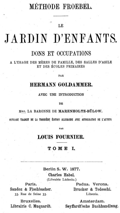 Book 1 of 'Le jardins d'enfant, dons et occupations' is a translation into French by Louis Fournier, published in 1877, of the 1874 third edition of Hermann Goldammer's 'Der Kindergarten'. A full copy of the work can be accessed online here. Further details will be added as time permits. ********** ********** |