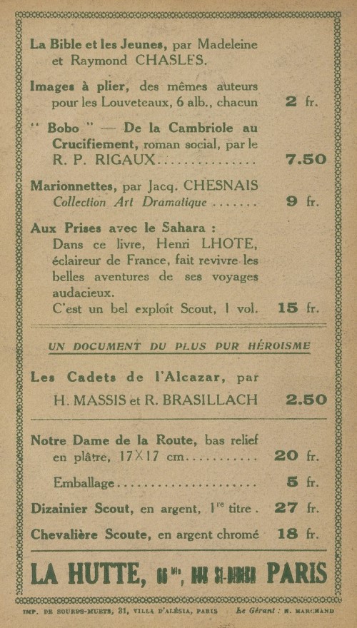 The six booklets of paperfolding designs published under the title 'Images a Plier' in 1932 were ascribed to the authorship of 'M R Chasles', who is otherwise unknown. Aurčle Duda has discovered that, in the back of the issue of Le Chef for 15th January 1936 (see here) is an advert for two books by Madeleine and Raymond Chasles, the first of which is 'La Bible et les Jeunes' and the second 'Images a Plier'. Of the latter the advert says 'from the same authors for Cub Scouts, 6 volumes each'. It therefore seems that 'M R Chasles' in 'Image a Pliers' should be interpreted as 'Madeleine and Raymond Chasles'. **********
