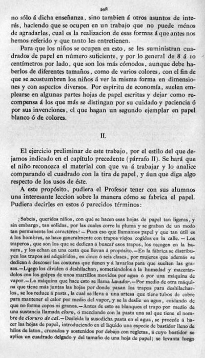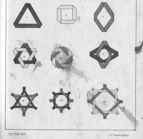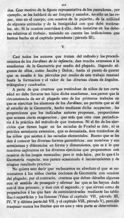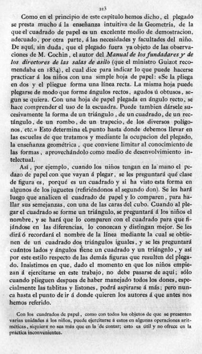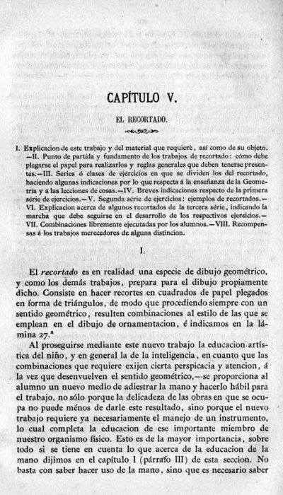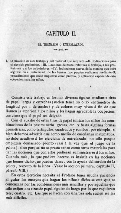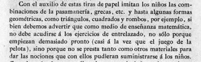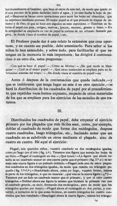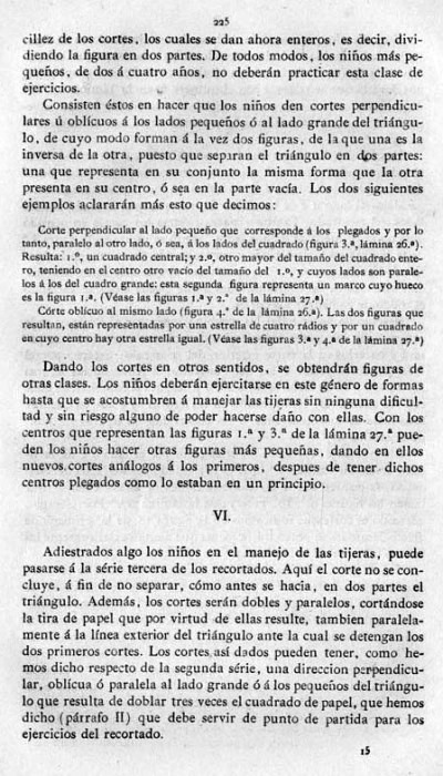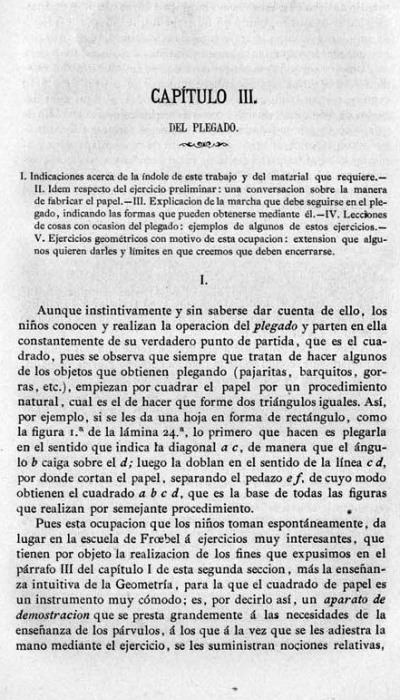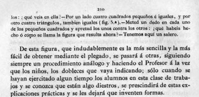 entry to meet the requirements of the rules). A full copy of the work can be accessed online here. Inter alia there are chapters devoted to the Froebelian occupations of El Trenzado o Entrelazado (Flechten and Verscnuren) , El Plegado (Falten) and El Recortado (Ausschneiden und Aufklaben). A full copy of the chapters relating to these occupations is included at the foot of this page. While the author relies heavily on material drawn from previous works such as those by Jacobs and Delon he criticises their belief that paperfolding is a useful way to teach mathematical concepts to young children. **********