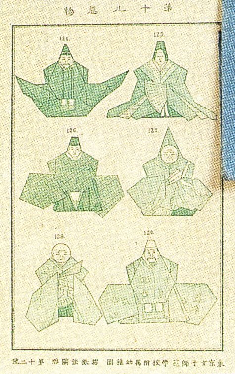 ********** 1923 'Falten und Formen mit Papier' by Richard Rothe which was published by Deutscher Verlag für Jugend und Volk in Vienna and Leipzig in 1923, contains an illustrtation of some Japanese Folded Human Figures. The text says inter alia 'These come from the same school in Tokyo and show that there, too, the making of toys is occasionally included in the lessons ... the shapes are similar to each other but each time with small changes'.