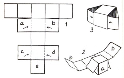 ********** 1961 A cube made using the cardboard modelling technique, but without requiring glue, appears in 'How to Make Things Out of Paper', which is a translation into English, published in 1961 by Sterling Publishing Co Inc in New York, of Walter Sperling's 1955 book 'Papier-Spiele'.