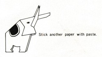 ********** 1951 A design for a three-legged elephant with an open back, folded from a bird base, appears in 'Origami to Kirinuki' by Saburo Ueda, which was published by Kokkado in Tokyo, most probably in 1951. The diagrams do not show how to obtain the tusks (which would require cuts).