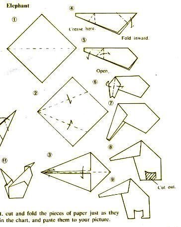 ********** The Cut Kite-Base Elephant - 1958 onwards A very simple cut elephant appears in 'Origami: Book Two' by Florence Sakade, which was published by the Charles E Tuttle Company in Rutland, Vermont and Tokyo in 1958