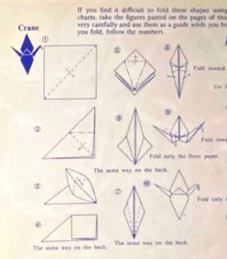 ********** In 'All About Origami' by Isao Honda, which was published by Toto Bunka Company, Limited in Tokyo in 1960. The instructions say the Crane should be inflated by blowing into the hole in the bottom.