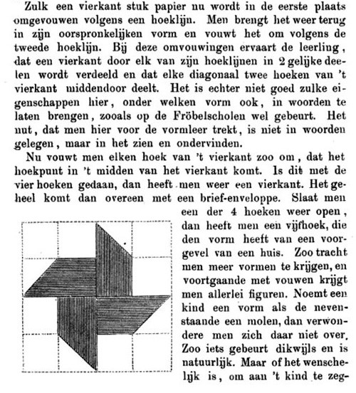 ********** The Closed Envelope / The Windmill Inter alia, the author says, roughly translated: 'the student learns that a square is divided into two equal parts ... However, it is not advisable to have such properties expressed in words ... as is often done in Froebel schools ... the theory of form lies not in words but in seeing and experiencing.' The passage goes on to explain how to blintz a square so that 'the whole thing resembles a letter envelope', one flap of which can be opened out to create a pentagon. The author also says: 'If a child calls a shape like the one shown here a windmill, don't be surprised ... But whether it is advisable to tell the child that this figure represents a windmill is another question, and one I wouldn't readily answer in the affirmative.'