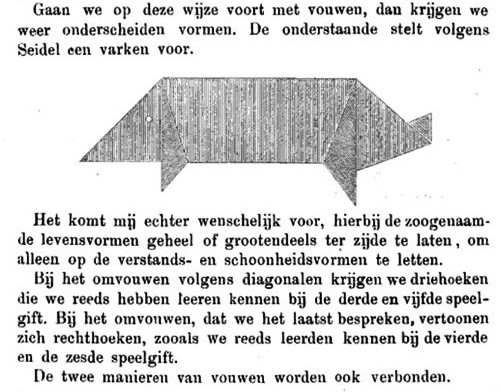 ********** The Pig The author says: 'If we continue folding in this manner we again get distinct shapes. According to Seidel, this one represents a pig. It seems to me, however, advisable to leave the so-called life forms enturely, or largely, aside, in order to pay attention only to the forms of knowledge and beauty.'