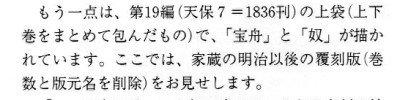 Roughly translated this reads: 'The other is the cover (which encases the first and second volumes together) of the 19th volume (published in 1836) which depicts a 'treasure ship' and a 'slave' Here we show a reprint edition with the volume number and publisher name removed, from the family collection, published after the Meiji period.' The reference to 19th volume is to 'Shuushi Inaka Genji' by Ryutei Tanehiko, which kunisada illustrated. The illustration in question is shown below: