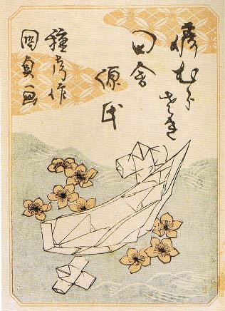 This print, which shows a Nakarabune and Komoso was mentioned by Satoshi Takagi in his 'Origami koten ni miru origami' (Origami from the Classics), which was published in 1993.