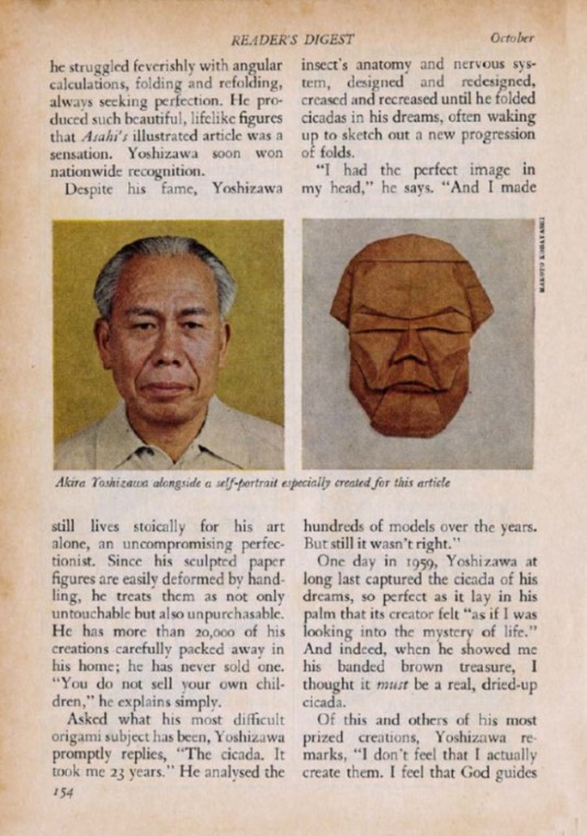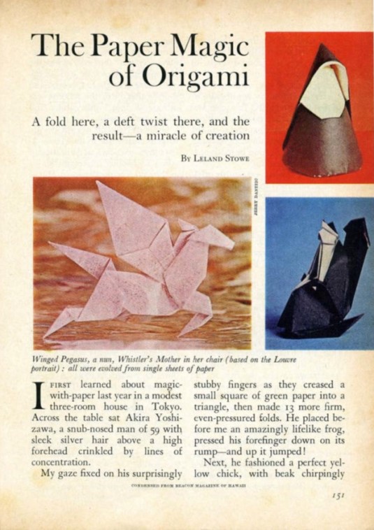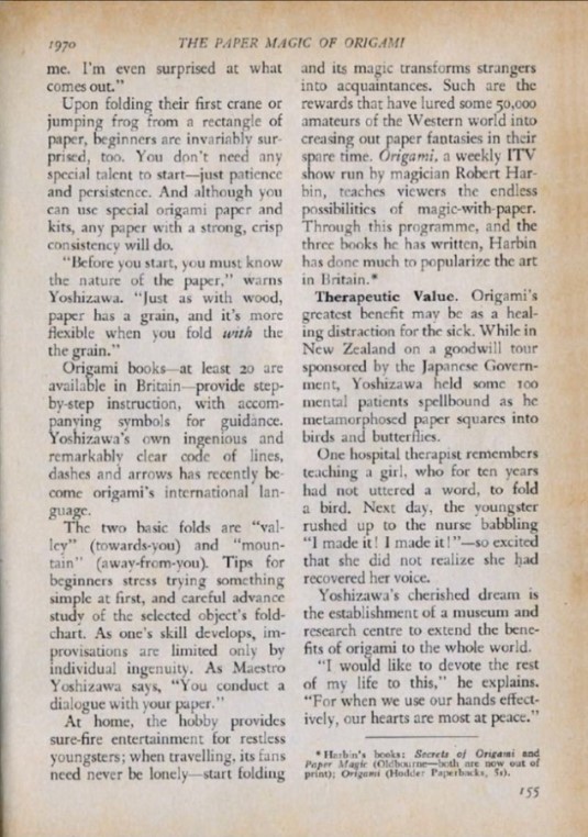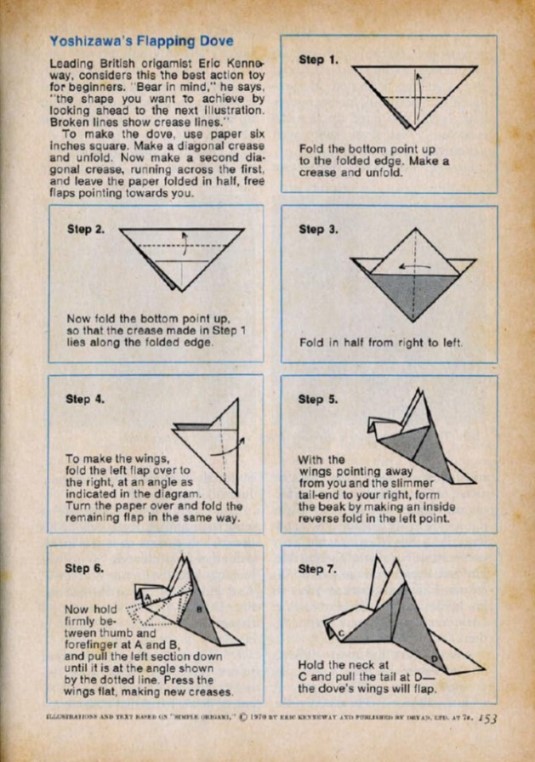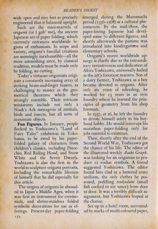 The USA version of Reader's Digest magazine of August 1970 published an article entitled 'Paper Magic of Origami' which was 'condensed' from a similar article in 'Beacon Magazine' of Hawaii. In October 1970 a similar article was published in the British version, which, according to the front cover, had a circulation of over 1.5 million copies. This version of the article included diagrams for a Dove that flaps its wings, said to be by Yoshizawa, taken from 'Simple Origami' by Eric Kenneway, which had been published earlier in 1970. My thanks to Wayne Brown for sharing his copy of this article with me. ********** *** *** *** *** *** |