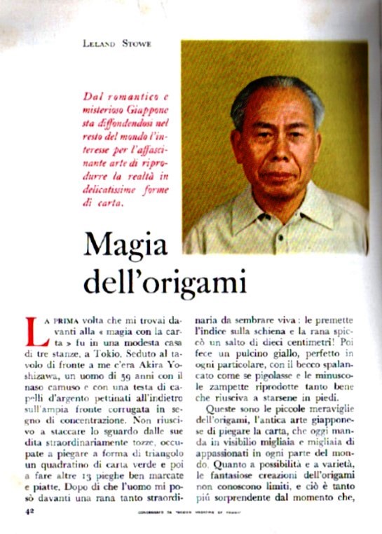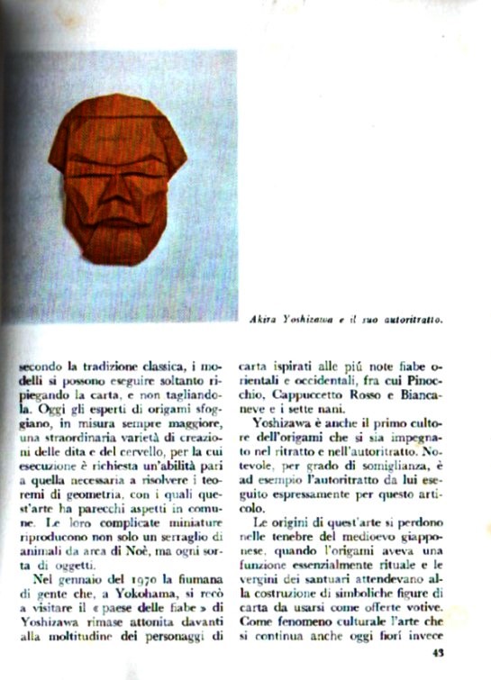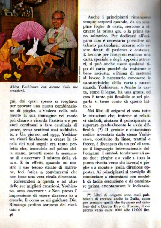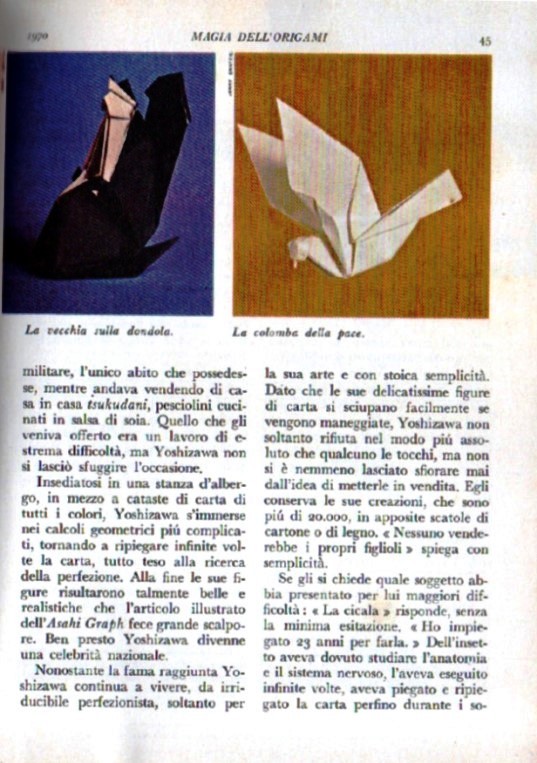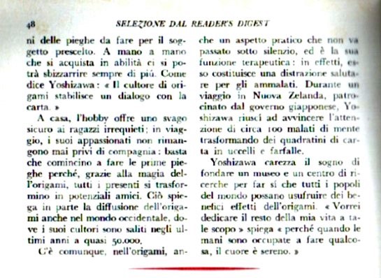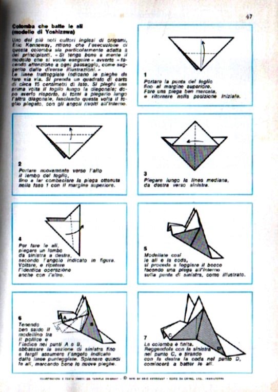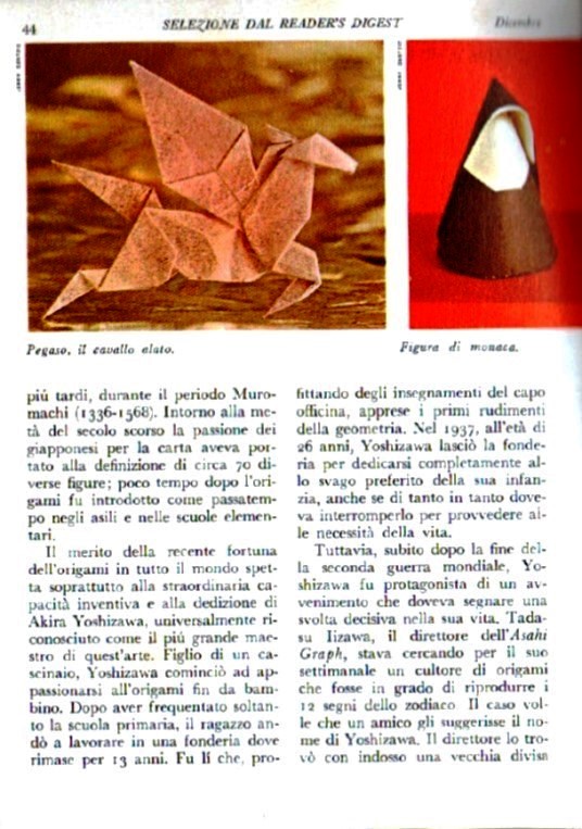 The USA version of Reader's Digest magazine of August 1970 published an article entitled 'Paper Magic of Origami' which was 'condensed' from a similar article in 'Beacon Magazine' of Hawaii. In November 1970 a similar article was published in the Italian language version of Reader's Digest, Selezione dal Reader's Digest. My thanks to Laura Rosenberg for sharing her copy of this article with me. This version follows the UK version, published in October 1970, in including a page of diagrams for a Dove that flaps its wings, said to be by Yoshizawa, which are borrowed from 'Simple Origami' by Eric Kenneway. ********** |