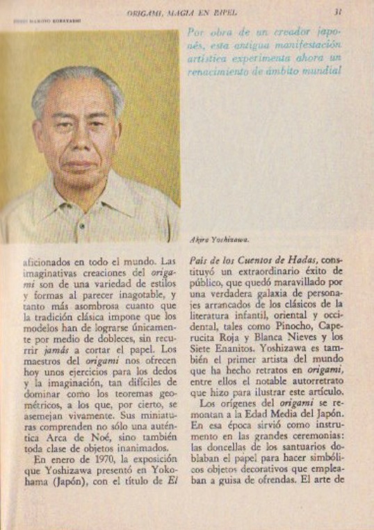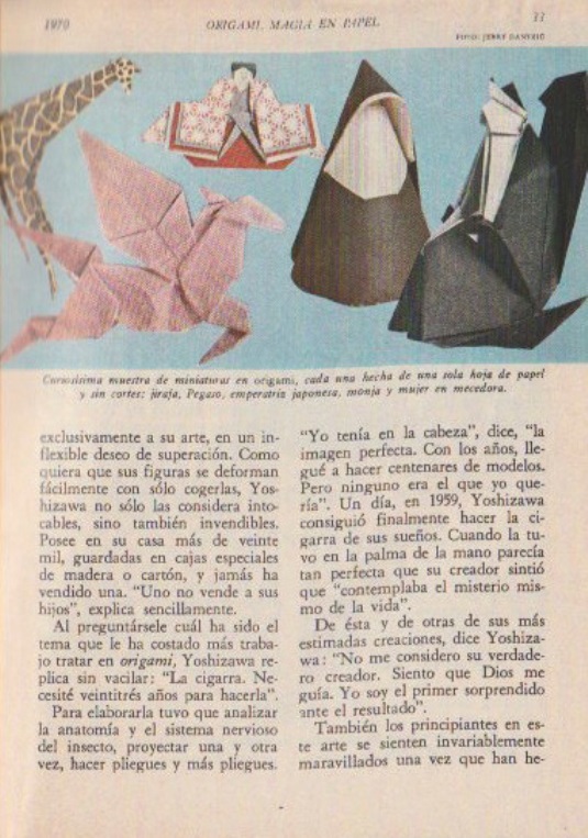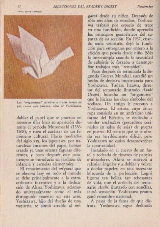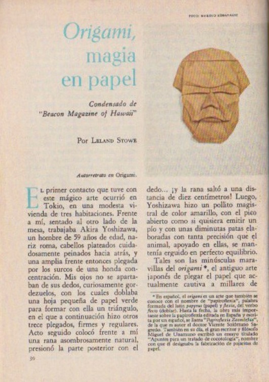 Digest, Selecciones del Reader's Digest. My thanks to Juan Gimeno for sharing his copy of this article with me. In this version the editor has added a footnote explaining the meaning of the word 'origami', which, presumably, would not otherwise have been understood by the readers. It says, roughly: 'In Spanish origami is an art that is also known by the name of "papiroflexia" a word formed from the Latin papyrus (paper) and flexia from the verb flecto (to bend). To date the most important work on origami published in Spain and written by a Spaniard is called "Papiroflexia Zoomórfica" authored by Dr Vicente Solórzano Sagredo. Also in his day the great writer and philosopher Miguel de Unamuno wrote an essay entitled "Apuntes para un tratado de cocotología" a name by which he designated the manufacture of paper pajaritas." ********** *** *** *** *** *** ********** |