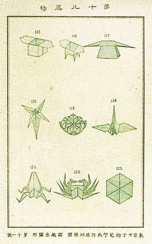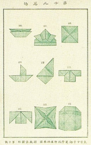 ********** Shinzo Seki's 'Yochien Ho Niju Yuki' (Twenty Joys of Play in Kindergarten) was published a year later in 1879 and contains drawings of children sitting at tables engaged in various kindergarten occupations. The illustration relating to the occupation of paperfolding shows a Paper Crane, a Noshi and what appears to be a windmill base with the front flaps folded in half outwards (which is possibly a Hanabishi). All of these designs are of Japanese, not Western European origin.