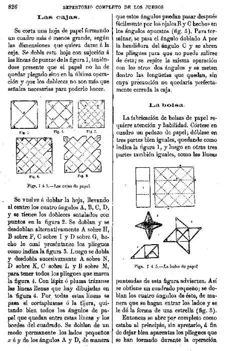 about paperfolding it contains is original. The illustrations featuring the Afghan Bands, the Flapping Bird and the Multiple-Image Pleated Paper Pictures were all originally published in 'La Nature'. See Individual Design Pages for details. The illustrations in the section headed 'Los Juguetes de Papel' are taken from 'Un million de jeux et de plaisirs' by T de Moulidars, which was first published in 1880. A full copy of the work can be accessed here. ********** Analysis The Cocotte / Pajarita This design appears on the cover but is not explained inside the book.