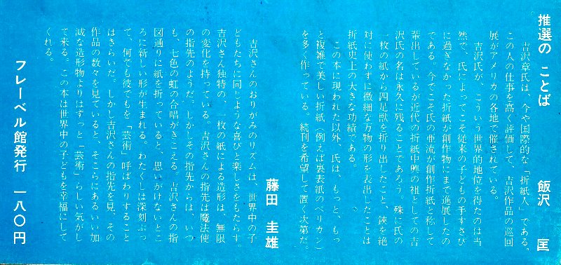 The wording on the right hand half of the back of the 'ribbon' is written by Tadashi Iizawa and reads, roughly translated: 'Akira Yoshizawa is now an international 'origami artist'. His work is so highly regarded that travelling exhibitions of Yoshizawa's work are being held in various parts of the United States. It is only natural that Yoshizawa has achieved such a global status. It is only through his efforts that origami, which was once merely a children's hobby, has been developed into an art. Nowadays his followers call it creative origami. Yoshizawa is known as the founder of the modern revival of origami. Folding a four-legged animal from a single sheet of paper is a great achievement in the history of origami. His name will live on forever. In addition to the origami pieces featured in this book, he has created many more intricate and beautiful pieces (such as the pelican on the back cover). I hope to see more similar books in the future.'