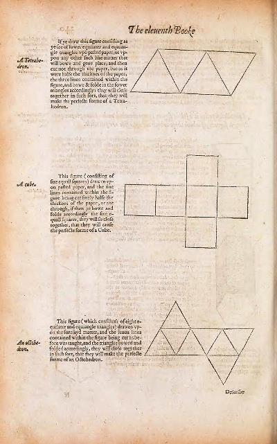 'The Elements of Geometrie' by Henry Billingsley, published by John Daye in London in 1570, is a translation of Euclid's 'Elements' into English with additional material added. Book 11 has been enhanced by the addition of 60 foldable paper models illustrating the text which are glued to the pages and can be raised into position when the pages are opened. There are also illustrations of several foldable polyhedral nets. See examples below. A full copy of the work can be accessed online here. **********