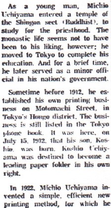 basis. ********** Vol 4: Issue 1 - Spring 1964 Main Matters of Interest: A report by Lillian Oppenheimer on an exhibition in the windows of the Takashimaya store on 5th Avenue in New York for two weeks during March 1964 and folding sessions held inside. For the most part the designs on display were by American folders but also included designs by Ligia Montoya, Akira Yoshizawa and Michio Uchiyama. *** A profile by Peter Van Note of 'three generations of paperfolders - the family Uchiyama' - grandmother, father and son: Grandmother - Unnamed *** Father - Michio Uchiyama:
