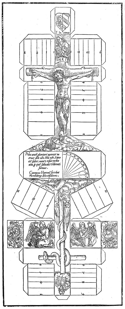 This woodcut by is for a print which can be folded up into a sundial in the form of a crucifix. The date comes from: