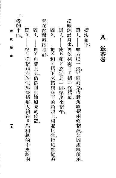 'Zhezhi Xinfa' (New Ways to Fold Paper) was published by The Commercial Press in China in 1934. The date of 1934 does not appear in the online copy of the work (which can be found here) but does appear in the information given about it. Part of one of the introductory pages is obscured (see below) and it is possible that the obscured section included the date of publication. Except for those relating to The New Steel Bed and The Cow's Head, all the illustrations in this work are redrawn from 'Winter Nights Entertainments' by R M Abraham, which was published by Constable and Constable in London in 1932. **********