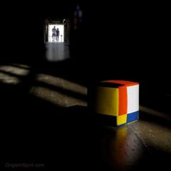 Mondrian Cube folded by Leyla Torres. Photo 'Playing with the Mondrian Cube at MASS MoCA' | |||||||||||||