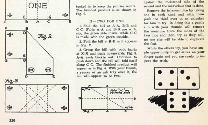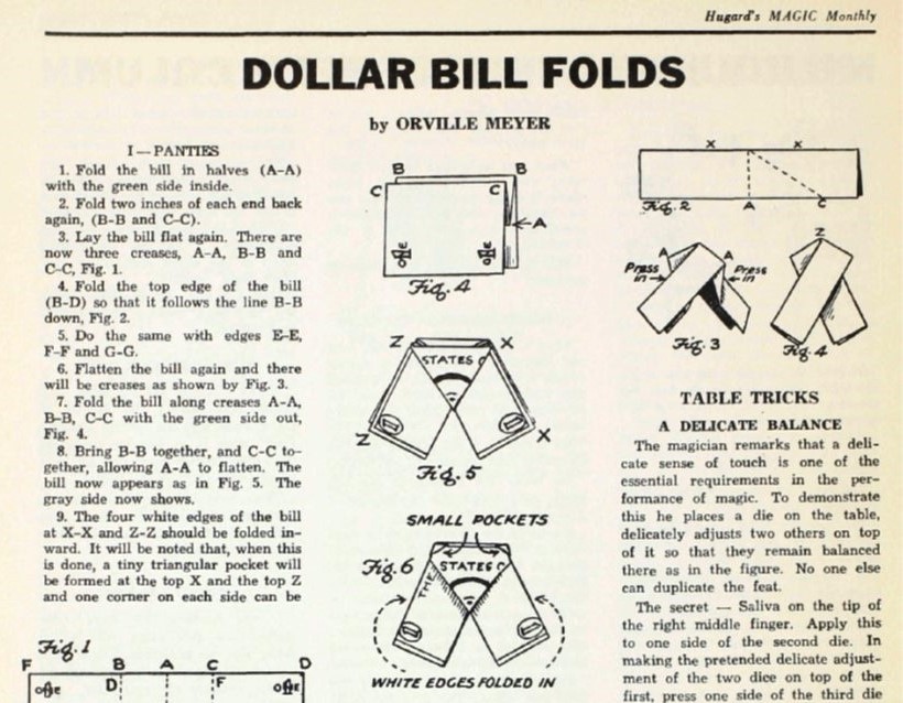 This article contains an explanation of two Dollar Bill Folds by Orville Meyer, 'Panties' and 'Two for One'. I am grateful to Edwin Corrie for allowing me to see a copy of this article. ********** This article is mentioned in Gershon Legman's 'Bibliography of Paperfolding', which was self-published in 1952.