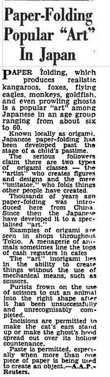 This article gives an interesting snapshot of origami in Japan in 1959 and contains the earliest known use of the word 'origami' in Australia. Inter alia it mentions that: 'A menagerie of animals sometimes line the tops of cash registers in cafes.' 'Purists frown on the use of scissors ...' 'Paste is permitted ...' The ghost with its 'hood spread out over its hollow countenance' is probably a reference to The Cut Phantom found in Isao Honda's books, and indeed the whole article is consistent with being based around his ideas and designs. **********