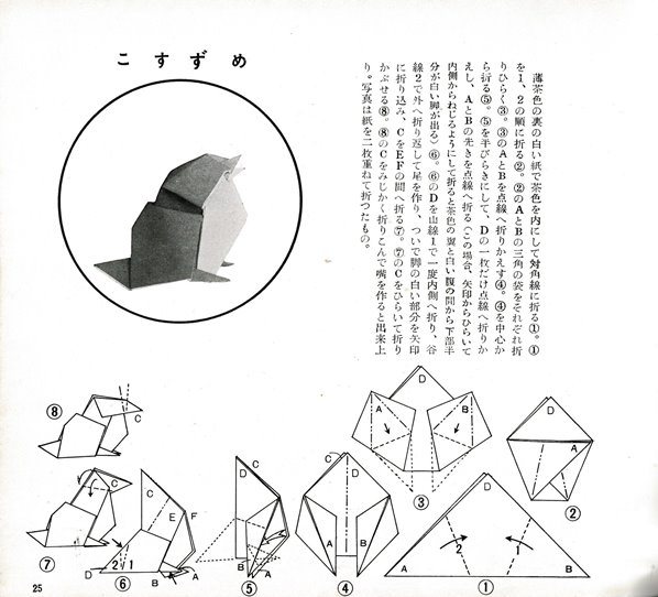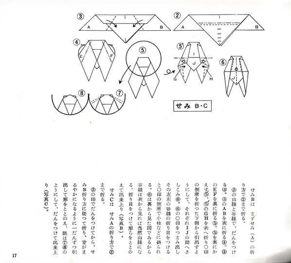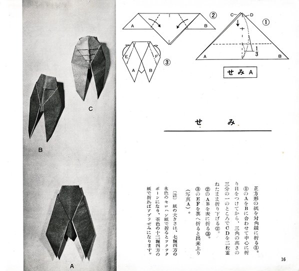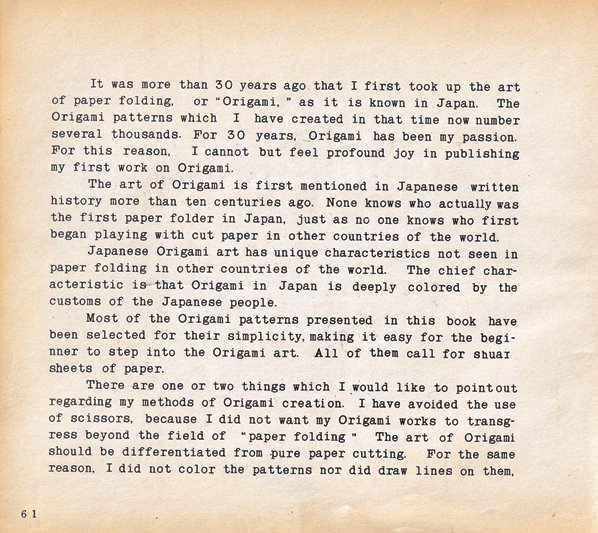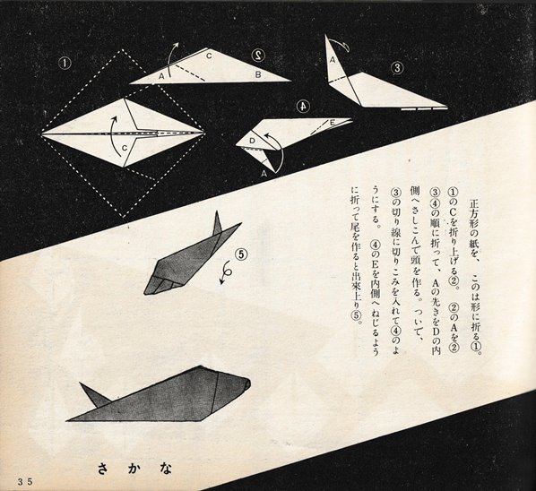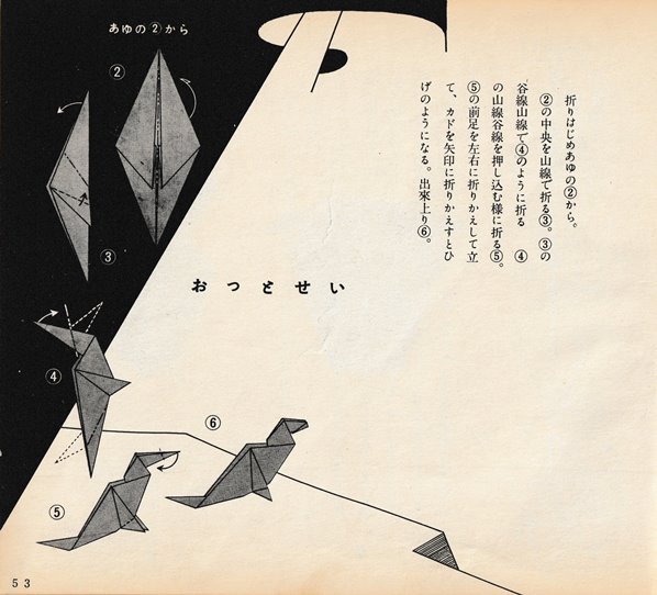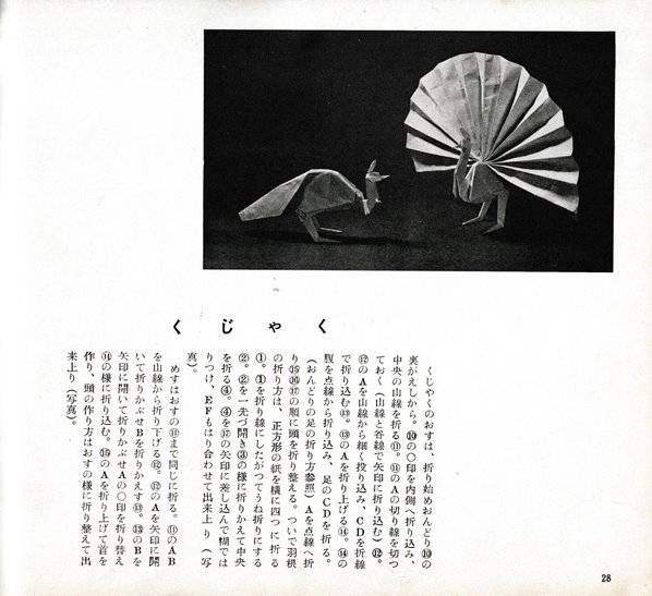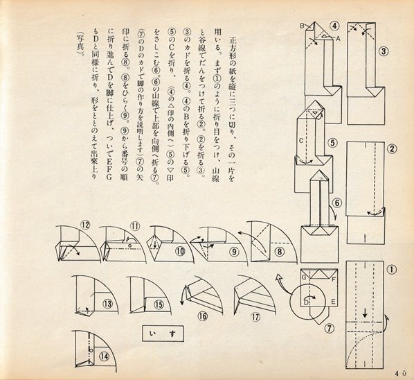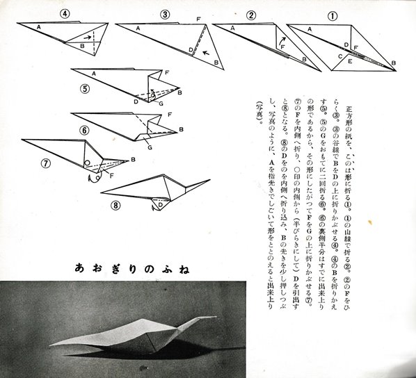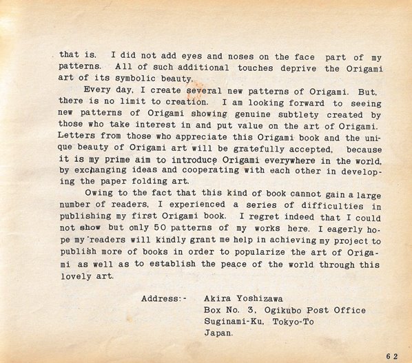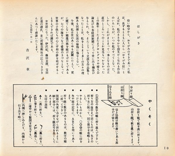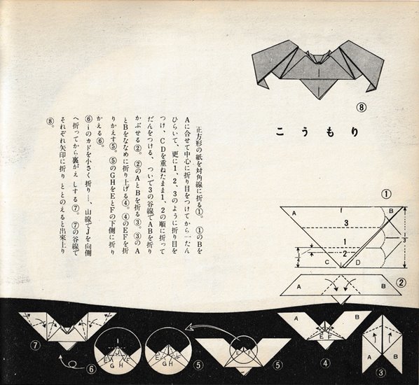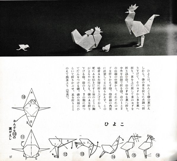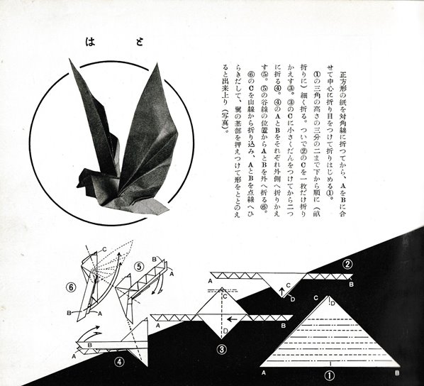 the library of the British Origami Society. ********** Introduction The original work consisted of two Forewords, a page explaining the diagramming system, various pages of diagrams and an author's Afterword. Yoshizawa subsequently wrote an additional Introduction in English. In David Lister's article 'The 1955 Exhibition By Akira Yoshizawa', written on 5th March 2005, he states 'The publishers later prepared some copies for Westerners and an additional introduction in English was stapled into the book.' To be clear, this English introduction was not stapled into existing finished books but added as an integral part of newly produced books when they were stapled together. I do not know at what date the English Introduction was added. In the article cited above David Lister states that 'The book was one of quite simple folding, but all the models were of Yoshizawas creation'. I cannot find any statement to this effect within the work and it is not clear to me whether or not it is completely true. The introductory material can be read in full below but I have extracted some of the passages which seem to me to be most important in illustrating Yoshizawa's views and intentions in publishing this work. ********** Inter alia, the English Introduction (see below) mentions that: 'It was more than 30 years ago that I first took up the art of 'paper folding' or Origami as it is known in Japan.' and 'Every day I create several new patterns of Origami.' 'Most of the origami patterns in this book have been selected for their simplicity.' 'All of them call for shuar (sic - ie square) sheets of paper.' (This is not precisely true. The diagrams on page 40 begin from a 3x1 rectangle.) 'I have avoided the use of scissors because I did not want my Origami works to transgress beyond the field of paper folding. The art of Origami should be differentiated from pure paper cutting. I did not color the patterns nor did draw lines on them, that is. I did not add eyes and noses on the face part of my patterns. All of such additional touches deprive the Origami art of its symbolic beauty.' (Note, however, that the crest of the Compound Peacock appears to be made using a cut. Also note that several of the designs are glued together, something that in Yoshizawa's view clearly does not deprive the designs of their symbolic beauty.) 'I am looking forward to seeing new patterns of Origami showing genuine subtlety created by those who take interest in and put value on the art of Origami.' ********** Inter alia, the First Foreword (see below), written by Tadasu Iizawa, the Editor of the Asahi Graf newspaper (which had first published some of Yoshizawa's designs), says, roughly translated: 'Yoshizawa-san is truly a genuine person. He is about to turn 50, but he still does origami. Some people call him eccentric, but when you talk to him, you realize he is just a focussed person and not strange at all. At present, he doesn't have a particular job and makes a living from origami, so it seems that his life is pretty tough, but he says, "If it comes down to it, I'll just start selling tsukudani again." Since I'm the one who introduced him to the world of journalism, I feel a strong sense of responsibility, but there are already researchers from outside Japan who have come to learn from him, so I am very pleased that his art will be further recognised with this new book. His works already number in the thousands, and even if I pose a difficult challenge, the next time we meet he has already folded it. It is amazing! These days he is even trying to make a leap from sketching nature to the world of abstraction.' ********** Inter alia, the Second Foreword (see below), written by Keio Fujita, the Editor in Chief of Chuokoron (the parent company of Fujin Korin magazine, which had also published articles explaining Yoshizawa's designs), says, roughly translated: 'I went to kindergarten for three years and had many female friends, so I knew a lot about origami ... One day, Takada Masamichi of the Fujin Koron editorial department brought in something strange. Calling it strange is a bit of a misnomer. It was a piece of origami that was extremely well made. It was a beautiful piece that could only be described as art, unlike our handicrafts. It was Yoshizawa's work, and for the next year he contributed various pieces to Fujin Koron.' ********** Inter alia, the Author's Afterword (see below) says, roughly translated: 'Records show that the tradition has a history of more than a thousand years, and some origami was used for recreational purposes, others for ceremonial purposes, and others for religious purposes. For a long time, there were creations that correctly conveyed the life of origami, and on the other hand, there were things like paper crafts that led origami down a wrong path, but when it went out of fashion, it was only the old folding methods that were passed down from generation to generation, and it was unfortunate that nothing new was created, for various reasons. However, fortunately, our "creative origami" has recently been generally accepted, which is very gratifying.' 'One thing I would like to mention is the friendship I have with Professor G. Legman of New York. He is an enthusiastic researcher of origami, which is rare for a foreigner, and as I have exchanged opinions with him about the history of origami, I have come to feel more confident about the spread of origami around the world. In a recent letter, he, who is now in Paris, encouraged me to translate and publish my book in English, French, and Spanish, and also to launch a world peace movement through origami as one of the projects of UNESCO and the International Red Cross.' ********** Analysis At present this is only a selective, not a full, analysis of the designs in the work. Flapping Bird This design has similarities to The Flapping Bird, but it is developed from the bird base in a different way and, as far as I can see, the flapping mechanism is not as goo