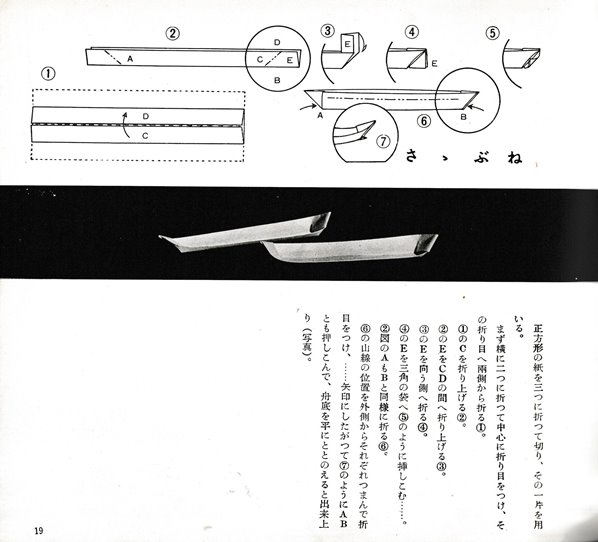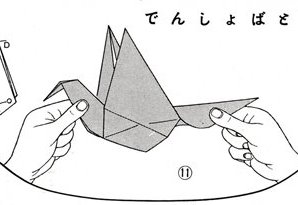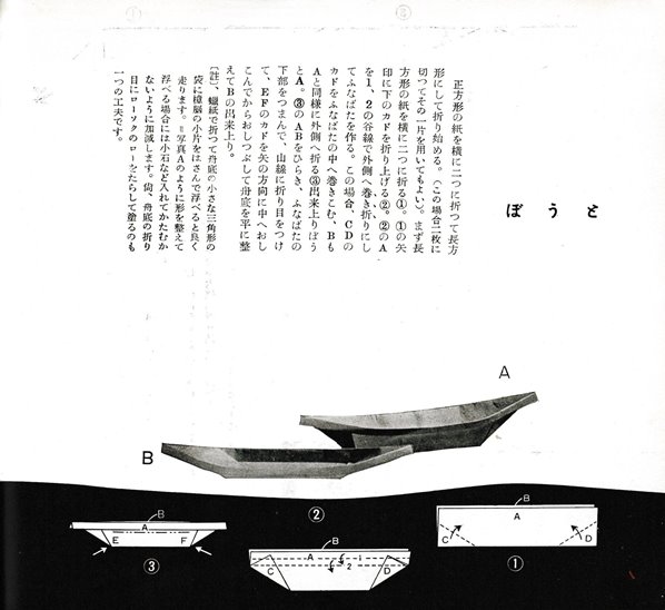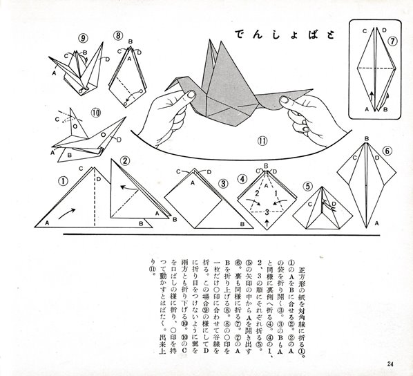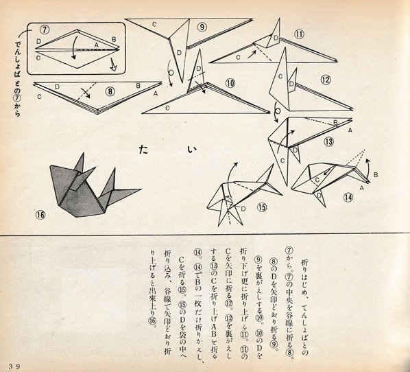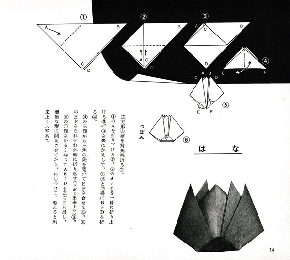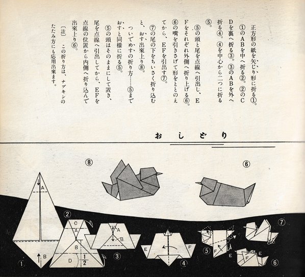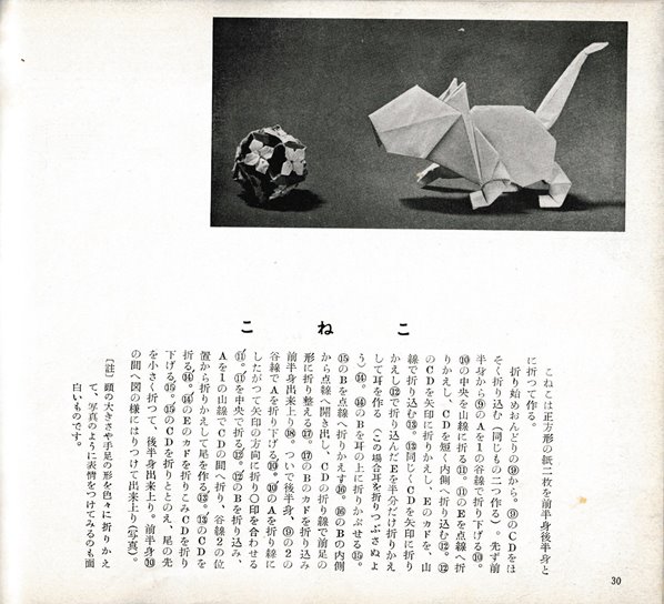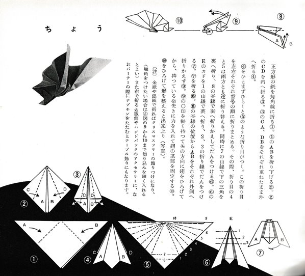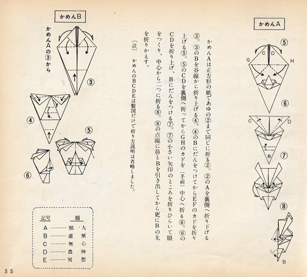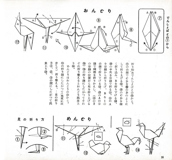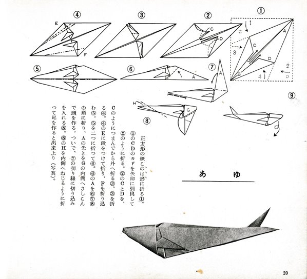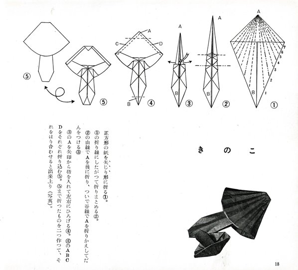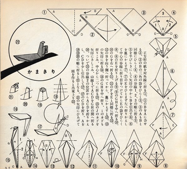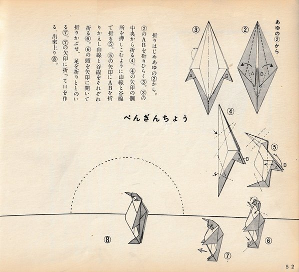 the library of the British Origami Society. ********** Introduction The original work consisted of two Forewords, a page explaining the diagramming system, various pages of diagrams and an author's Afterword. Yoshizawa subsequently wrote an additional Introduction in English. In David Lister's article 'The 1955 Exhibition By Akira Yoshizawa', written on 5th March 2005, he states 'The publishers later prepared some copies for Westerners and an additional introduction in English was stapled into the book.' To be clear, this English introduction was not stapled into existing finished books but added as an integral part of newly produced books when they were stapled together. I do not know at what date the English Introduction was added. In the article cited above David Lister states that 'The book was one of quite simple folding, but all the models were of Yoshizawas creation'. I cannot find any statement to this effect within the work and it is not clear to me whether or not it is completely true. The introductory material can be read in full below but I have extracted some of the passages which seem to me to be most important in illustrating Yoshizawa's views and intentions in publishing this work. ********** Inter alia, the English Introduction (see below) mentions that: 'It was more than 30 years ago that I first took up the art of 'paper folding' or Origami as it is known in Japan.' and 'Every day I create several new patterns of Origami.' 'Most of the origami patterns in this book have been selected for their simplicity.' 'All of them call for shuar (sic - ie square) sheets of paper.' (This is not precisely true. The diagrams on page 40 begin from a 3x1 rectangle.) 'I have avoided the use of scissors because I did not want my Origami works to transgress beyond the field of paper folding. The art of Origami should be differentiated from pure paper cutting. I did not color the patterns nor did draw lines on them, that is. I did not add eyes and noses on the face part of my patterns. All of such additional touches deprive the Origami art of its symbolic beauty.' (Note, however, that the crest of the Compound Peacock appears to be made using a cut. Also note that several of the designs are glued together, something that in Yoshizawa's view clearly does not deprive the designs of their symbolic beauty.) 'I am looking forward to seeing new patterns of Origami showing genuine subtlety created by those who take interest in and put value on the art of Origami.' ********** Inter alia, the First Foreword (see below), written by Tadasu Iizawa, the Editor of the Asahi Graf newspaper (which had first published some of Yoshizawa's designs), says, roughly translated: 'Yoshizawa-san is truly a genuine person. He is about to turn 50, but he still does origami. Some people call him eccentric, but when you talk to him, you realize he is just a focussed person and not strange at all. At present, he doesn't have a particular job and makes a living from origami, so it seems that his life is pretty tough, but he says, "If it comes down to it, I'll just start selling tsukudani again." Since I'm the one who introduced him to the world of journalism, I feel a strong sense of responsibility, but there are already researchers from outside Japan who have come to learn from him, so I am very pleased that his art will be further recognised with this new book. His works already number in the thousands, and even if I pose a difficult challenge, the next time we meet he has already folded it. It is amazing! These days he is even trying to make a leap from sketching nature to the world of abstraction.' ********** Inter alia, the Second Foreword (see below), written by Keio Fujita, the Editor in Chief of Chuokoron (the parent company of Fujin Korin magazine, which had also published articles explaining Yoshizawa's designs), says, roughly translated: 'I went to kindergarten for three years and had many female friends, so I knew a lot about origami ... One day, Takada Masamichi of the Fujin Koron editorial department brought in something strange. Calling it strange is a bit of a misnomer. It was a piece of origami that was extremely well made. It was a beautiful piece that could only be described as art, unlike our handicrafts. It was Yoshizawa's work, and for the next year he contributed various pieces to Fujin Koron.' ********** Inter alia, the Author's Afterword (see below) says, roughly translated: 'Records show that the tradition has a history of more than a thousand years, and some origami was used for recreational purposes, others for ceremonial purposes, and others for religious purposes. For a long time, there were creations that correctly conveyed the life of origami, and on the other hand, there were things like paper crafts that led origami down a wrong path, but when it went out of fashion, it was only the old folding methods that were passed down from generation to generation, and it was unfortunate that nothing new was created, for various reasons. However, fortunately, our "creative origami" has recently been generally accepted, which is very gratifying.' 'One thing I would like to mention is the friendship I have with Professor G. Legman of New York. He is an enthusiastic researcher of origami, which is rare for a foreigner, and as I have exchanged opinions with him about the history of origami, I have come to feel more confident about the spread of origami around the world. In a recent letter, he, who is now in Paris, encouraged me to translate and publish my book in English, French, and Spanish, and also to launch a world peace movement through origami as one of the projects of UNESCO and the International Red Cross.' ********** Analysis At present this is only a selective, not a full, analysis of the designs in the work. Flapping Bird This design has similarities to The Flapping Bird, but it is developed from the bird base in a different way and, as far as I can see, the flapping mechanism is not as goo