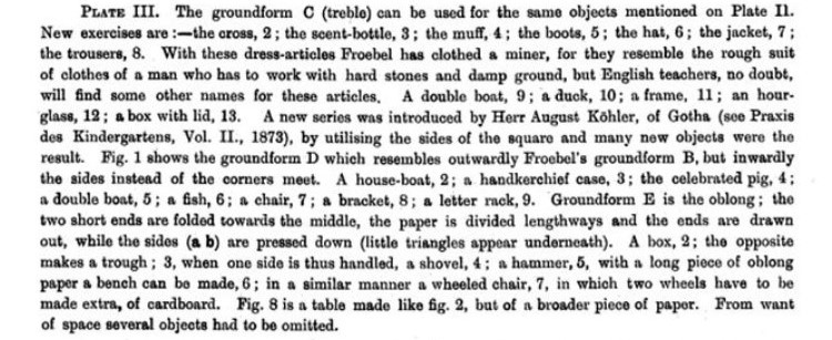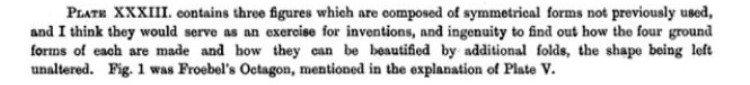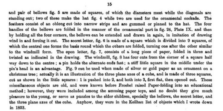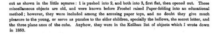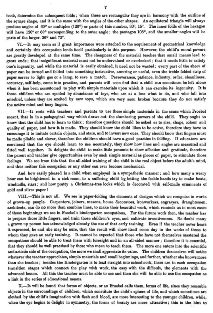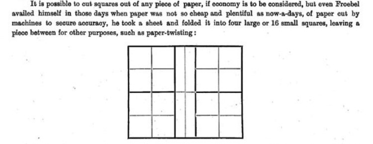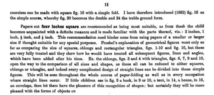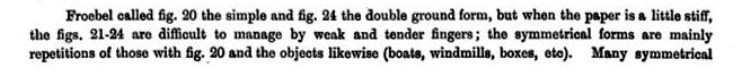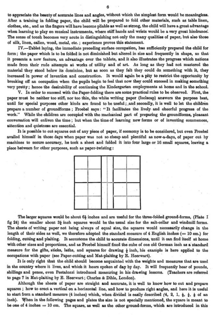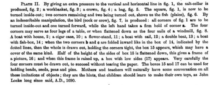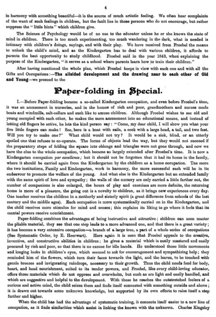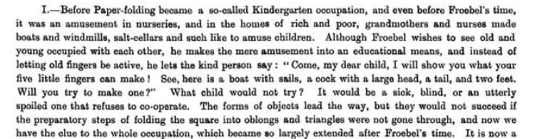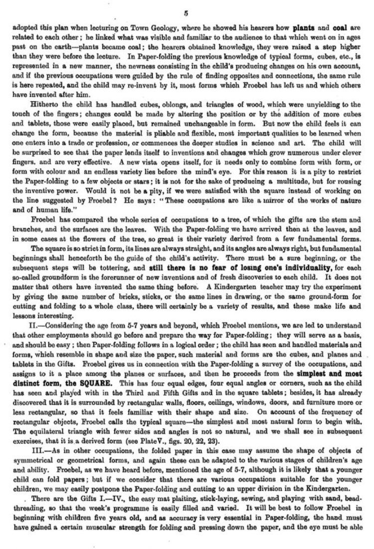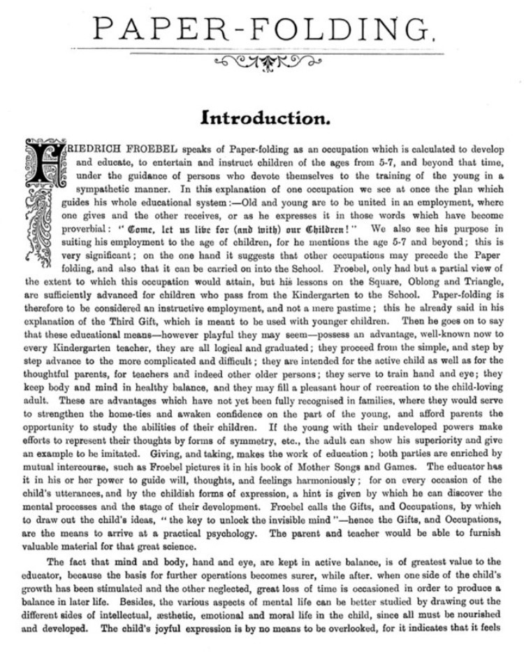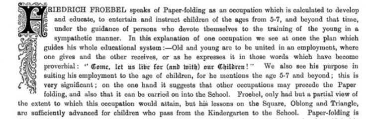 ********** Information about the extent and limitations of Froebel's own paperfolding From the Introduction - Froebel saw paperfolding as an occupation for children of ages 5 to 7 and beyond.