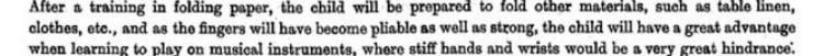 ********** On paperfolding as manual training Heerwart considers that the practice of folding improves the ability of the child to carry out other manual tasks, although this is not its primary purpose.: