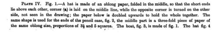 The words 'These miscellaneous objects ... were known before Froebel raised Paper-folding into an educational method' imply that by contrast the Forms of Life pictured on the preceeding plates were not known before Froebel's time. ********** 1. A Hat - The Newspaper Hat
