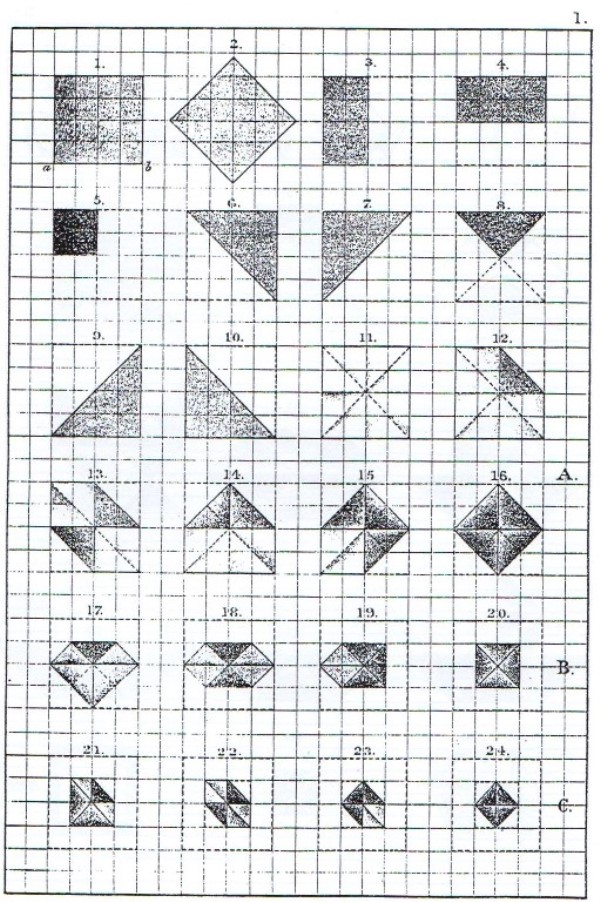 ********** Froebel's Basic Folds and Groundforms - Plate I This Plate illustrates some basic folds and Froebel's system of groundforms from which Folds of Life and Folds of Beauty can be developed. The author states that Froebel called fig. 20 (the doubly blintzed square) the simple groundform and fig 24 (the triply blintzed square) the double groundform but that since 1862 she has referred to fig 16 (the blintzed square) as the simple groundform, fig 20 as the double groundform and fig 24 as the treble ground form. She also indicates that children may see various figures as Simple Folds of Life, fig 3 - a book, fig 9 or 10 - a tent, fig 14 - a house and fig 16 - an envelope.