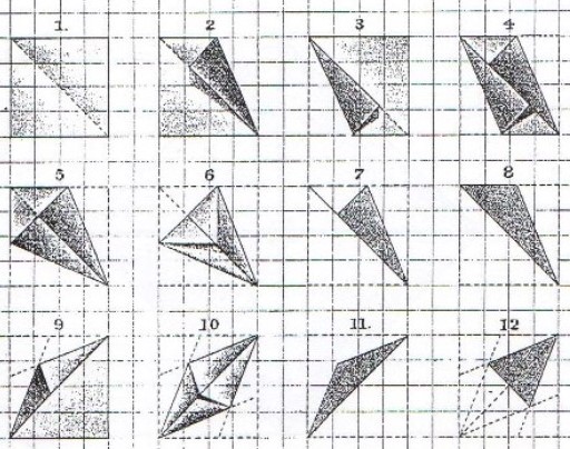 ********** It is somewhat strange to find designs 9 to 13 at this point in the book, since they are not normally folded from a doubly blintzed, rather than a triply blintzed, square. In addition, the Double Boat has already been illustrated on the previous plate. 9. A Double Boat - The Double Boat