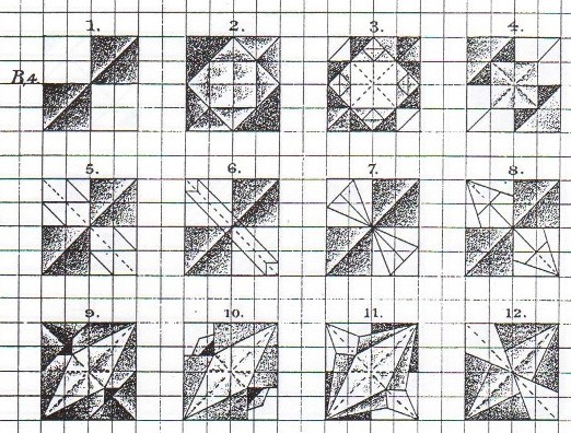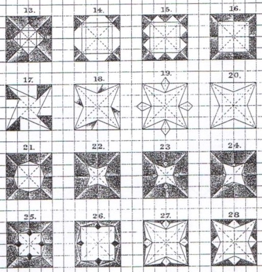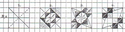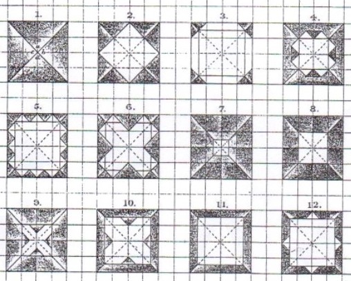 Figure 1 shows the result of folding all the corners folded to the centre in turn. The other designs are produced by first folkding three corners to the centre to produce a triangle.