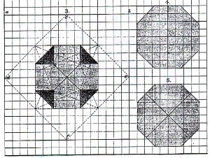 Picture 5 shows a new groundform made by folding an octagon onto a blintzed square and tucking the corners inside the layers, which can then be used as the basis of Folds of Beauty. The text relating to Plate V, Fig 16, stated this was an invention of the author's.