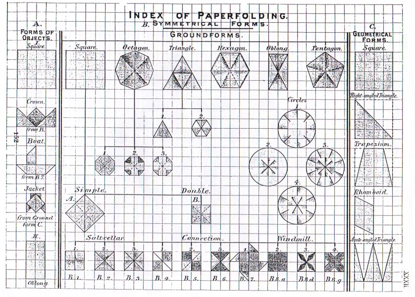 ********** Index to Sub-sections This page includes 5 preliminary notes: On the names of groundforms On paperfolding as a creative activity On paperfolding as manual training Information about Paperfolding before Froebel's time Information about the extent and limitations of Froebel's own paperfolding And a full Analysis divided into 26 sub-sections: Froebel's method of cutting four squares from a rectangle - from the Introduction The Visual Index - Plate XXXII Froebel's Basic Folds and Groundforms - Plate I Folds of Life from Froebel's Simple Groundform - Plate II Folds of Life from Froebel's Double Groundform - Plate III Designs from Kohler's Groundform - Plate III Miscellaneous designs (from the Keilhau list of objects written down in 1853) - Plate IV Cut and Fold Polyhedral Nets - Plate IV New Geometrical Folds - Plate V Folds of Beauty from The Blintzed Square - Plate VI and Plate VII Folds of Beauty from Kohler's Groundform - Plate VII Folds of Beauty from Side 1 of the Double Blintz Base - Plate IX Folds of Beauty from Side 2 of the Double Blintz Base - Plate IX Folds of Beauty from the doubly blintzed square - Plate IX Folds of Beauty developed from groundforms B4 to B7 - Plate X Folds of Beauty from Groundform B8 - The Windmill Base - Plate XI and XII Folds of Beauty from Octagonal Groundforms- Plates XIII to XV How to use templates to construct hexagons, 60/120 rhombi and equilateral triangles in quantity - Plate XVI Folds of Beauty from Equilateral Triangles - Plate XVIII to XIX Folds of Beauty from Hexagons - Plate XX Folds of Beauty from the 60/120 Rhombus - Plate XXI Folds of Beauty from Pentagons - Plate XXII and XXIII Folds of Beauty from Cut Circles - Plates XXIV to XXVII Combinations of Geometric Forms - Plate XXVIII and XXIX Getafel Formen - designs made by treating Forms of Beauty as tiles - Plate XXX and XXXI Exercises for inventions and ingenuity - Plate XXXII ********** On the names of groundforms The Author refers to the three main groundforms, the blintzed square, the doubly blintzed square, and the triply blintzed square in several ways. Groundform A - The Blintzed Square - the Author says that Froebel did not call this fold a groundform. She, however, calls it either 'the simple groundform' or simply 'groundform A'. Groundform B1 - Side 1 of The Double Blintz Basic Form, a square blintzed, turned over and blintzed again, which has four square flaps meeting at the centre. The Author says that Froebel called this 'the simple groundform'. She, however, calls it 'the double groundform' or simply 'groundform B'. Groundform B2 - Side 2 of the Double Blintz Basic Form, which has four triangular flaps meeting at the centre Groundform B3 - The Doubly Blintzed Square - a square blintzed twice without turning it over in between the two operations. Groundform B4 - made from a square which is white one side and coloured on the other. The corners of the square are blintzed alternately backwards and forwards, then blintzed again, all corners moving forwards. On the side where the triangular flaps are white the paper is pulled out from inside the blintzes to form flaps that are like those of a Windmill Base, except there are only two of them rather than four. Groundform B5 and B6 - It is not clear to me how these groundforms are to be constructed, but it may be that whereas in the case of B4 two of the corners are converted into corners of the Windmill Base, in these groundforms one and three corners are converted in the same way. Groundform B7 - The Windmill. Groundform B8 - what we now call The Windmill Base. Groundform C - The Triple Blintz basic Form - the Author says that Froebel called this 'the double groundform'. She, however, calls it 'the treble groundform' or simply 'groundform C'. Groundform D - The author also mentions a groundform developed by August Kohler which she calls 'groundform D' and which I call 'Kohler's Groundform'. In addition Plate VII introduces three octagonal groundforms from which Folds of Beauty can be developed. ********** On paperfolding as a creative activity The author clearly sees paperfolding as a creative activity and not as the sterile reproduction of a series of predetermined forms. There is a clear implication that this was Froebel's original view. Thus