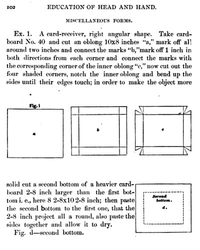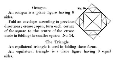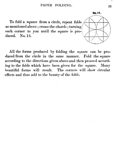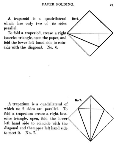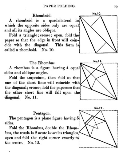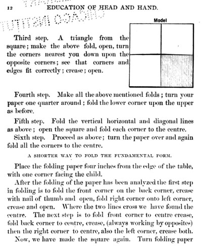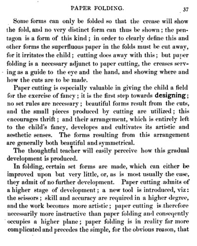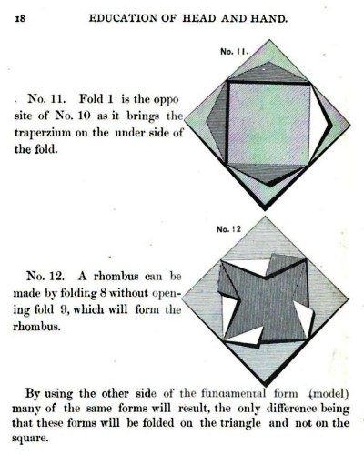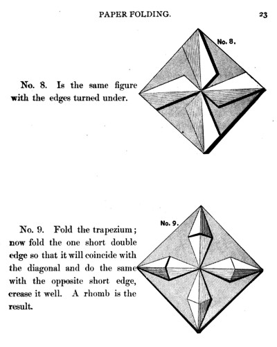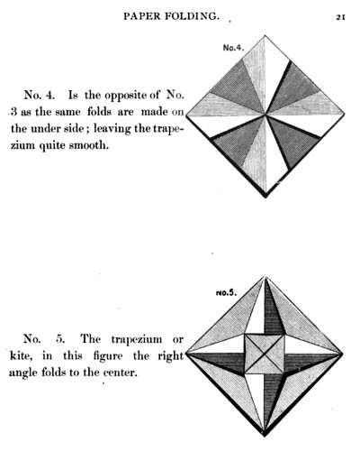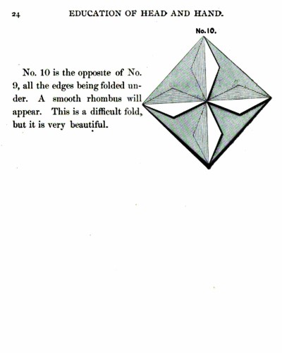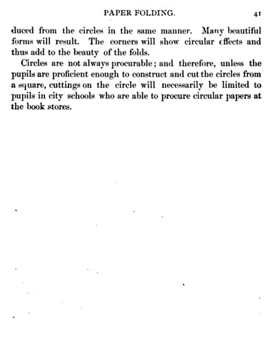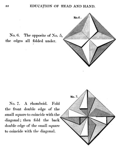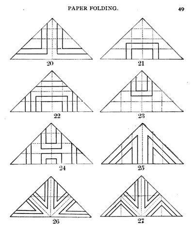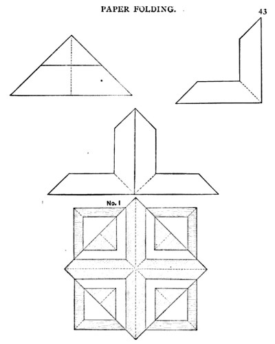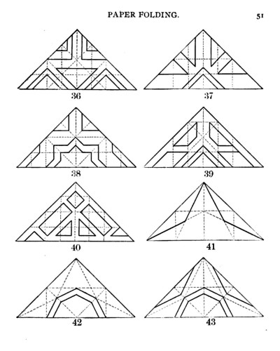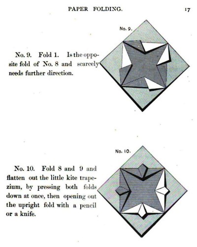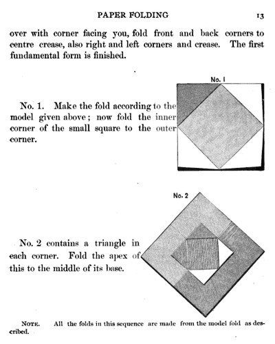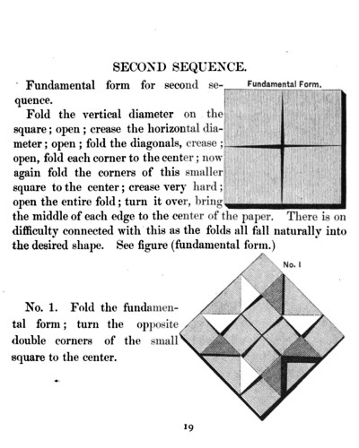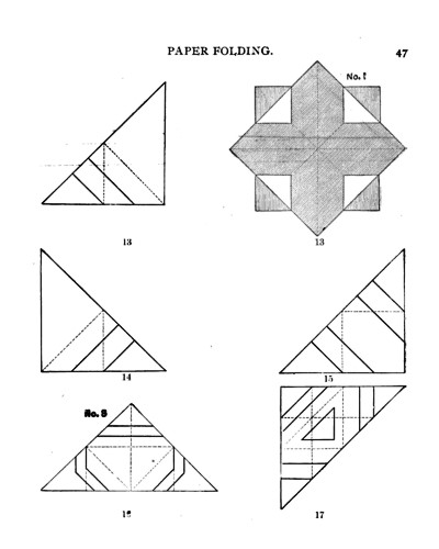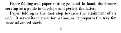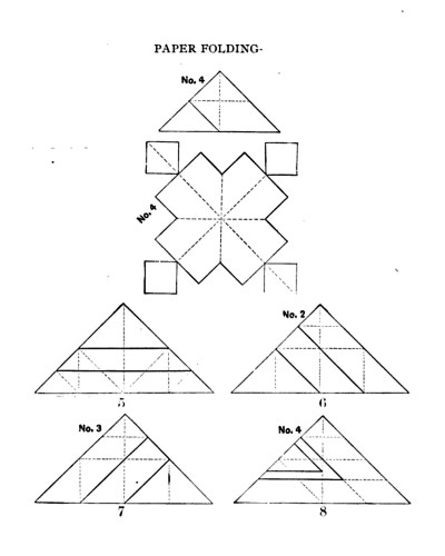 Not all the leaflets include paperfolding material. A full copy of the work can be accessed here. Parts of the work were later republished in various forms including as 'How to Cut and Fold Paper' (in 1922) and 'Bamberger's Manual of Paper Folding, Clay Modelling and Cardboard Work'. ********** The aujthor sees paperfolding as a step on the way to papercutting rather than a valuable activity in its own right: